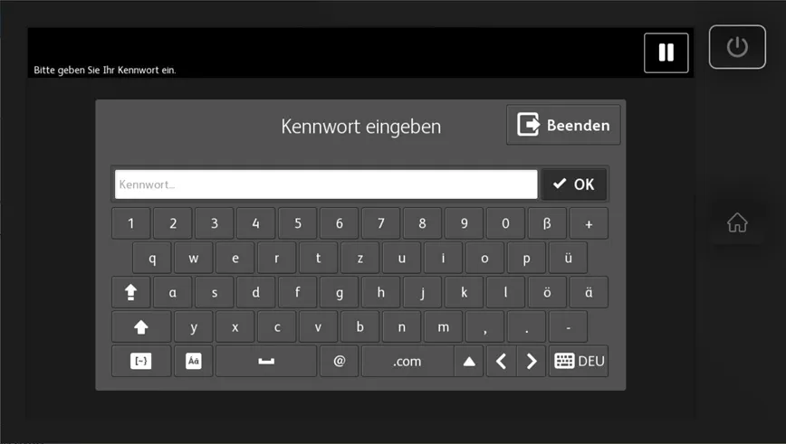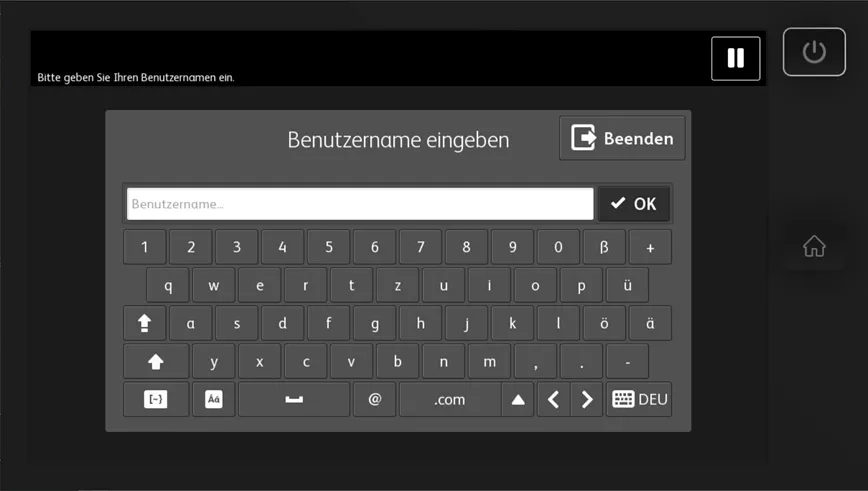 Nach einer Bestätigung müssen Sie sich nun mit Ihren Anmeldeinformationen anmelden. Geben Sie im ersten Dialog Ihren Benutzername und anschließend im zweiten Ihr Kennwort ein. Stimmen beide Informationen überein, so sind Sie nun am Multifunktionsdrucker angemeldet und die zuvor unbekannte Karte wurde im System für Ihr Benutzerkonto erfolgreich registriert.