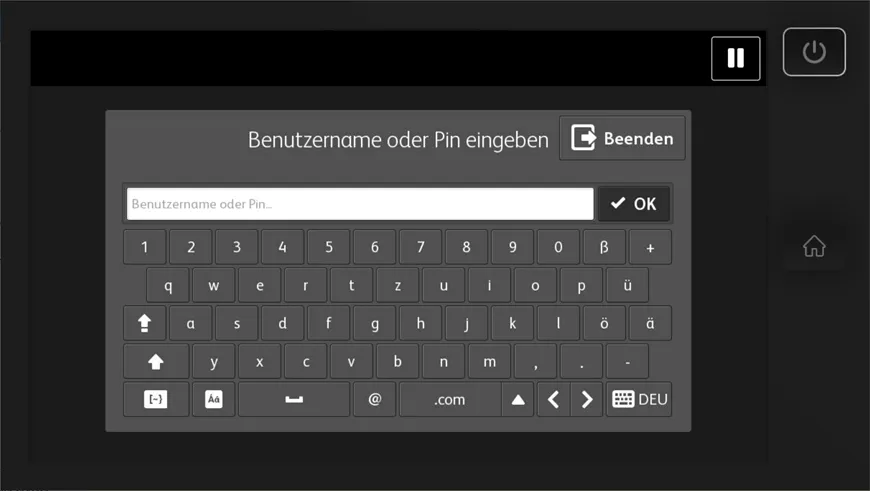 Durch Benutzerkarte direkt über den Kartenleser, um den Xerox Multifunktionsdrucker zu entsperren. Nach erfolgreicher Anmeldung sehen Sie in der linken oberen Ecke Ihren Anmeldenamen und alle jene für Sie freigehaltenen Funktionen. Diese können sich je nach Multifunktionsdrucker und angemeldeten Benutzer unterscheiden.