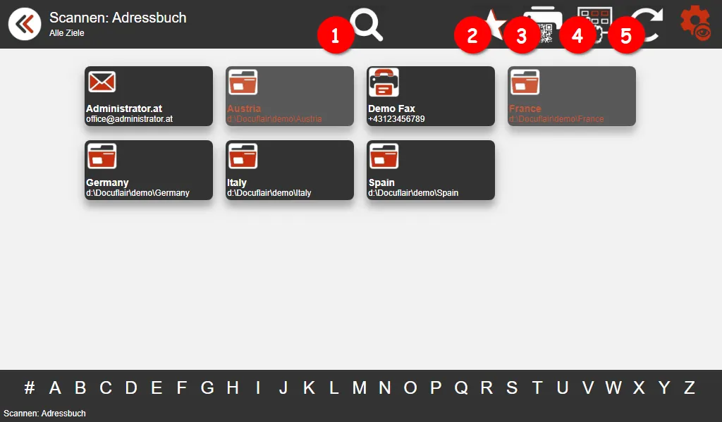 Obiges Beispiel zeigt den Start des Standard-Adressbuches, das nach der Erstinstallation mit einigen Scan-Zielen für Demonstrationszwecke befüllt wird, die gescannte Dokumente nach x:\Docuflair\demo ablegen. Diese Kontakte können bedenkenlos gelöscht oder ersetzt werden.