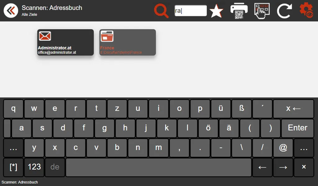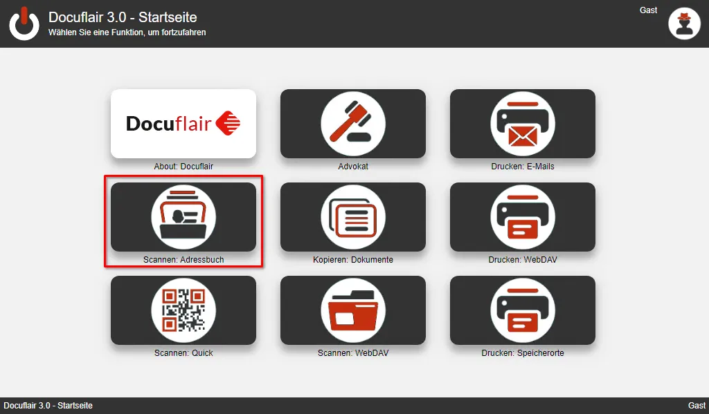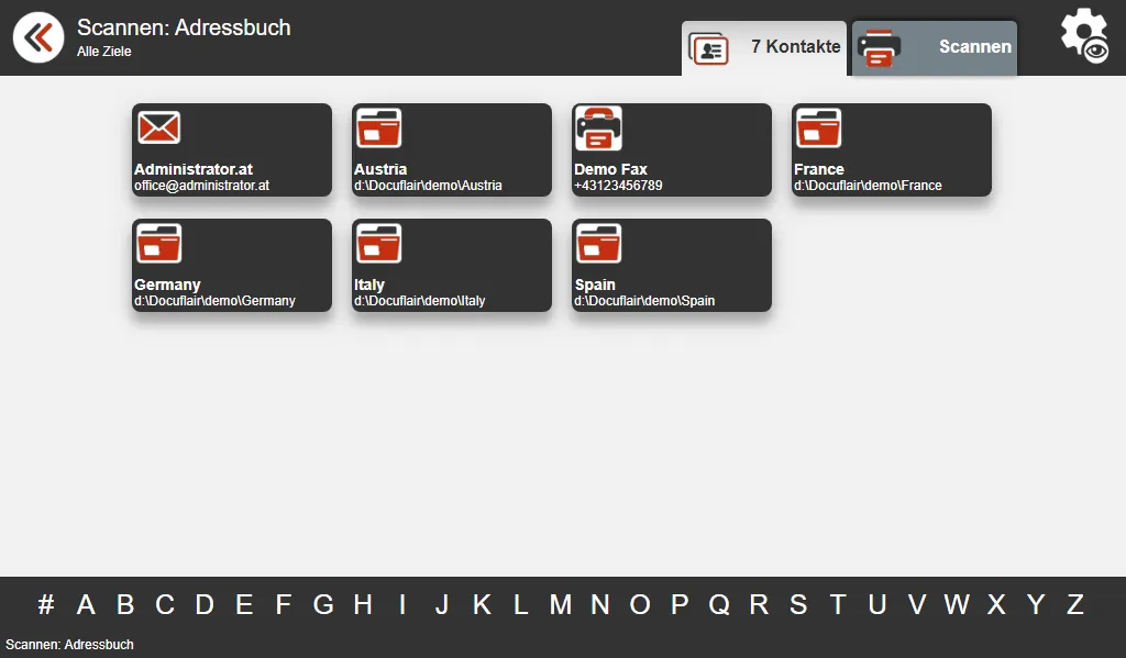 Das Adressbuch ermöglicht das einfache Scannen an Kontakte. Ein Kontakt kann als Scan-Ziel eine E-Mail-Adresse, einen Speicherort oder eine Fax-Nummer festlegen. Die Verwaltung von Adressbüchern und Kontakten wird hier beschrieben.