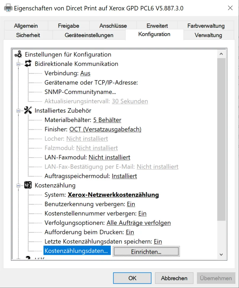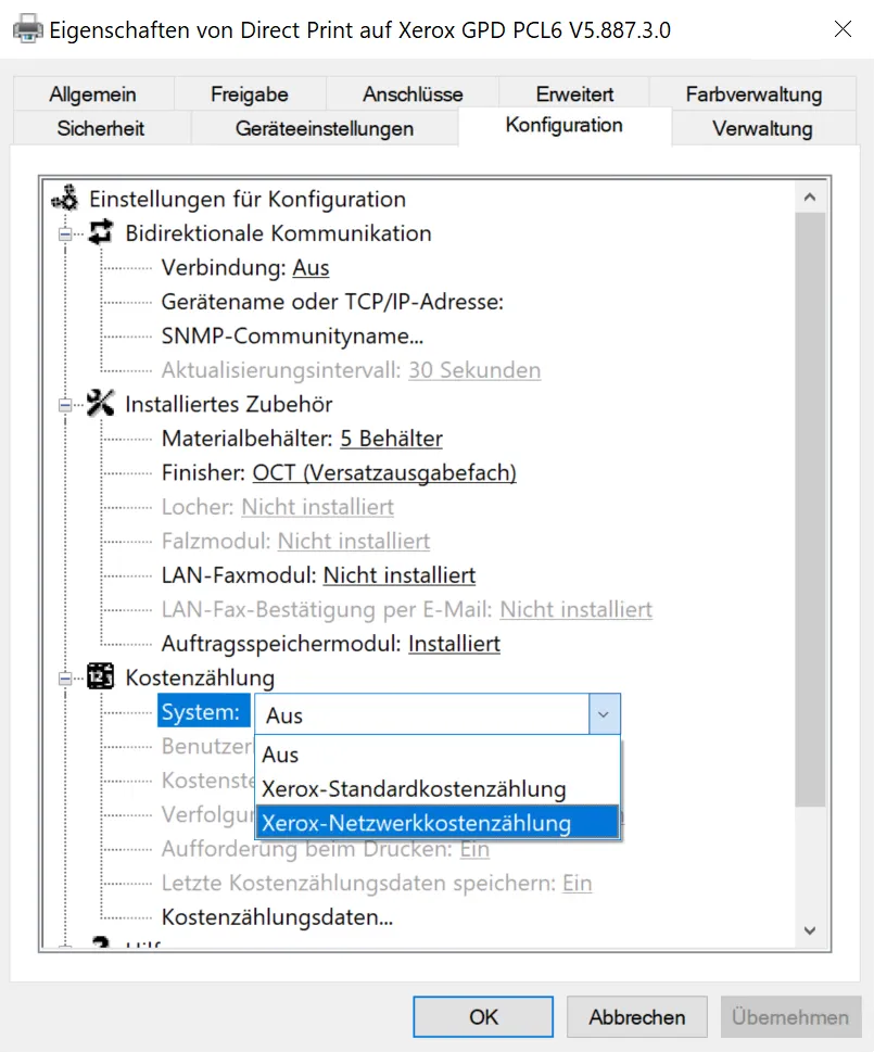 Im Reiter Konfiguration muss unter Kostenzählung das System auf Xerox-Netzwerkkostenzählung umgestellt werden.