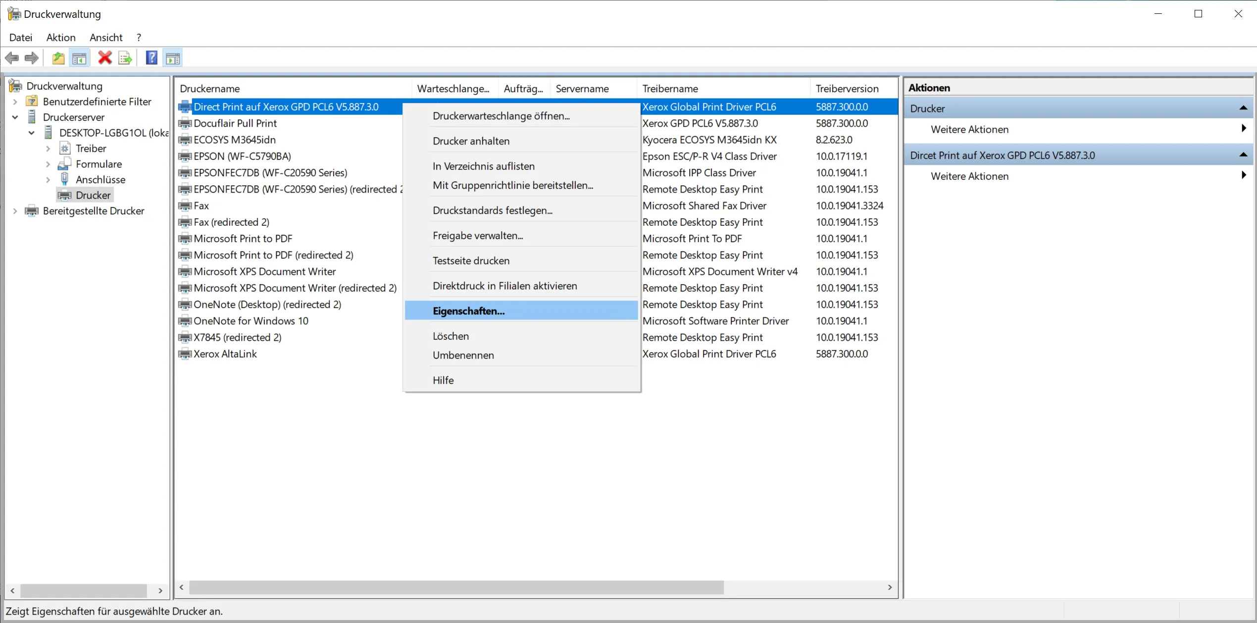 In der Windows Druckverwaltung (Windows+R printmanagement.msc) die Eigenschaften des gewünschten Xerox Druckertreibers öffnen. Es wird empfohlen den Xerox Global Print Driver zu verwenden.