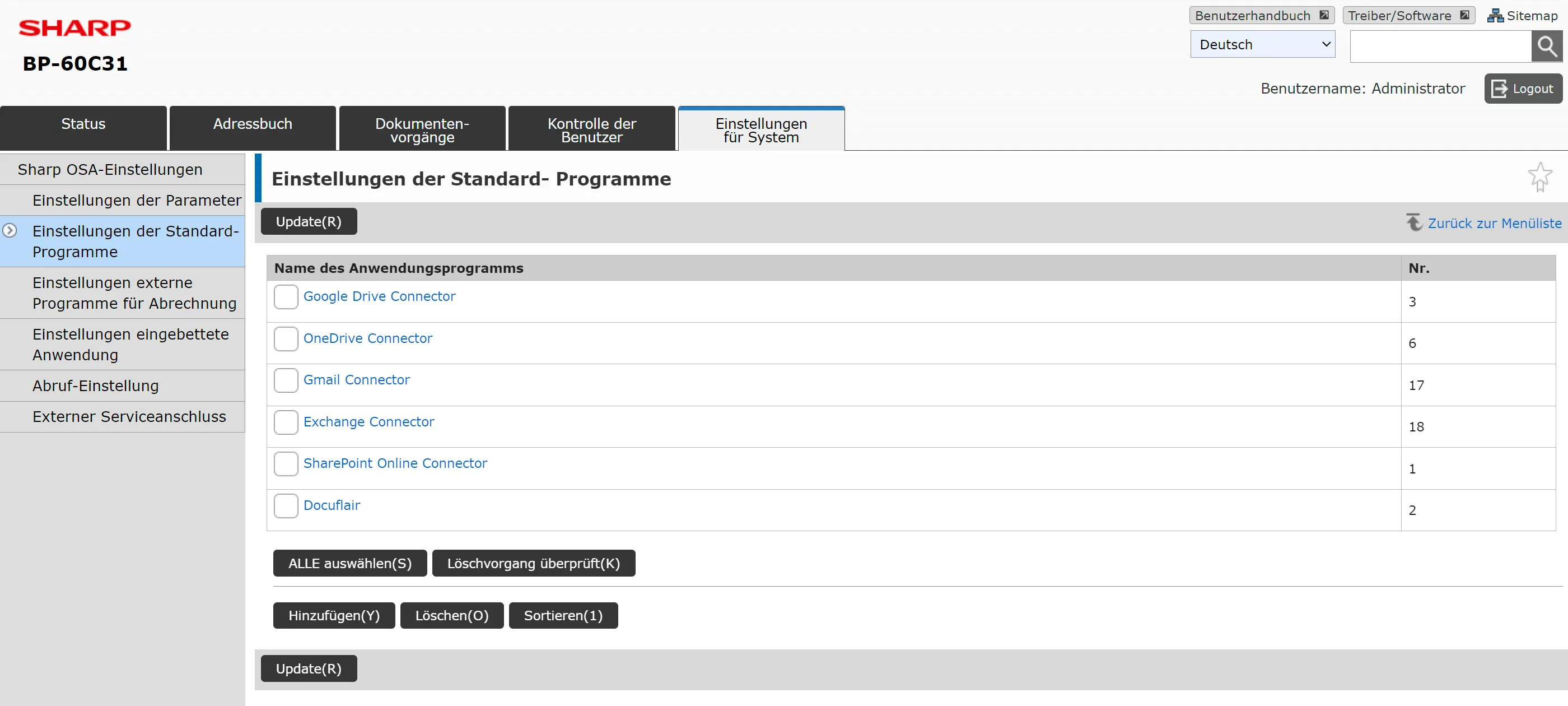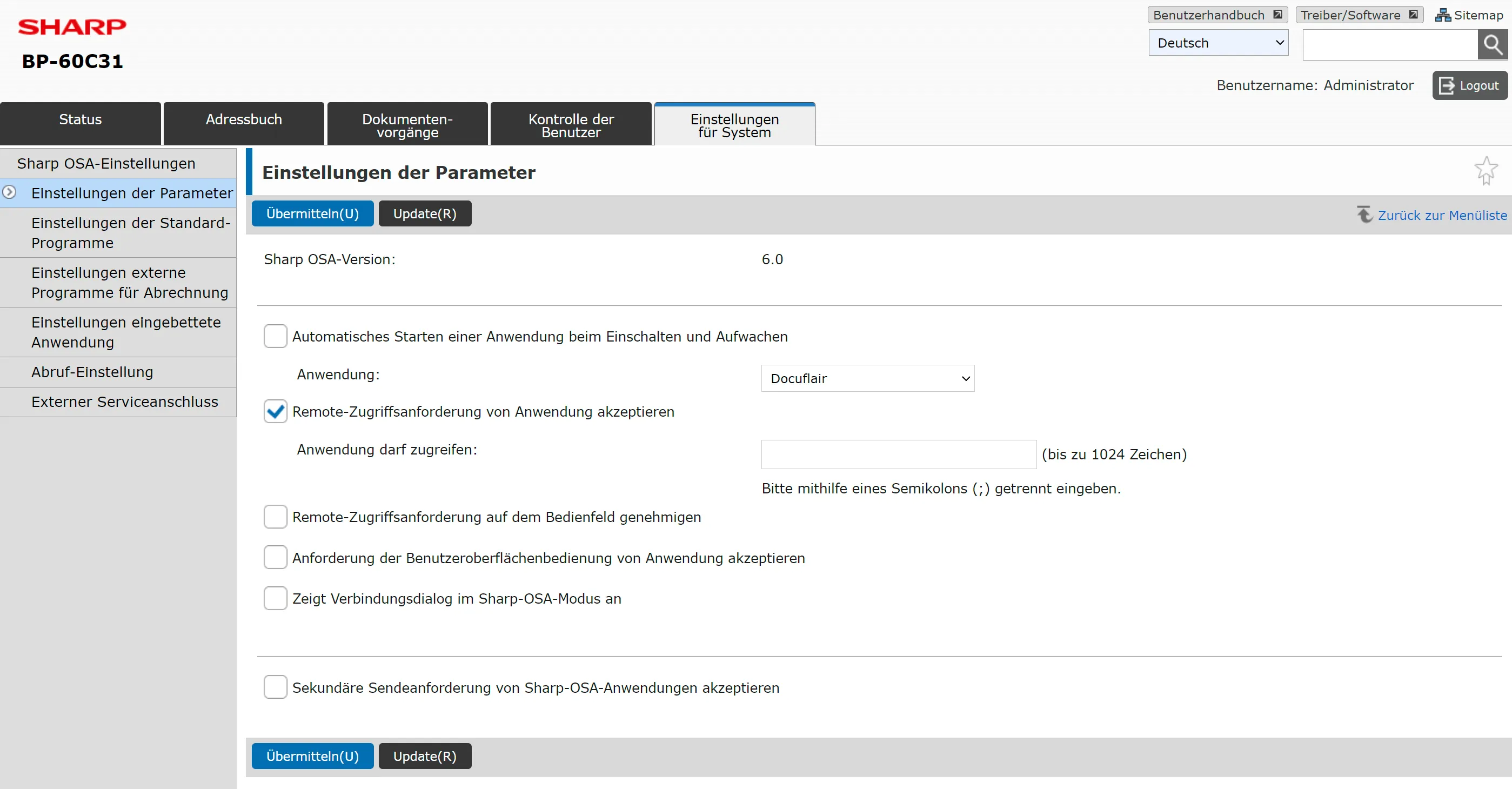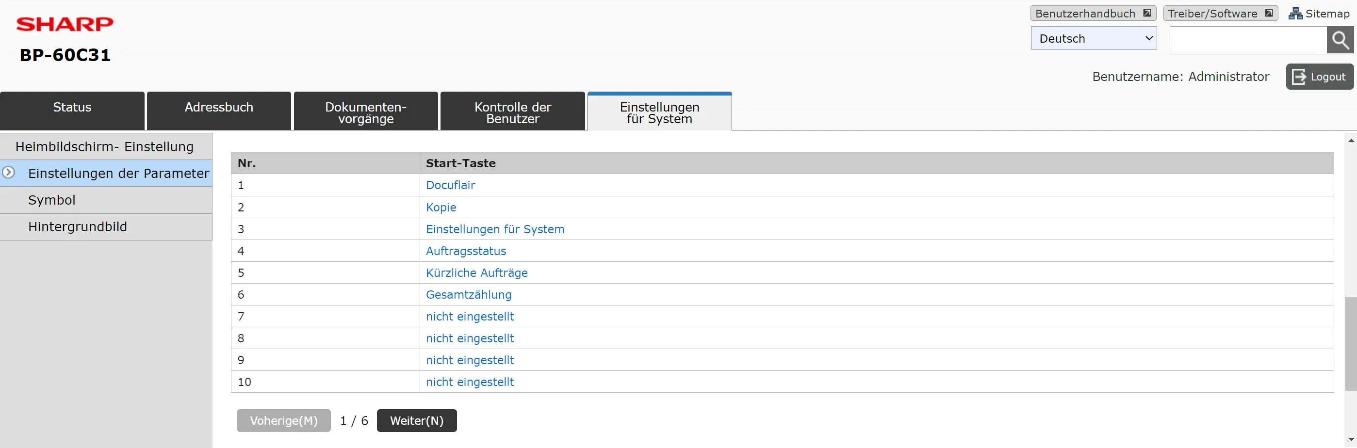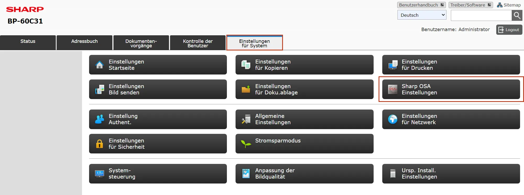 Nach erfolgreicher Anmeldung wird Ihnen die Startseite der Geräte-Webseite angezeigt. Navigieren Sie über den Menüpunkt Einstellungen für System zu den Sharp OSA Einstellungen.