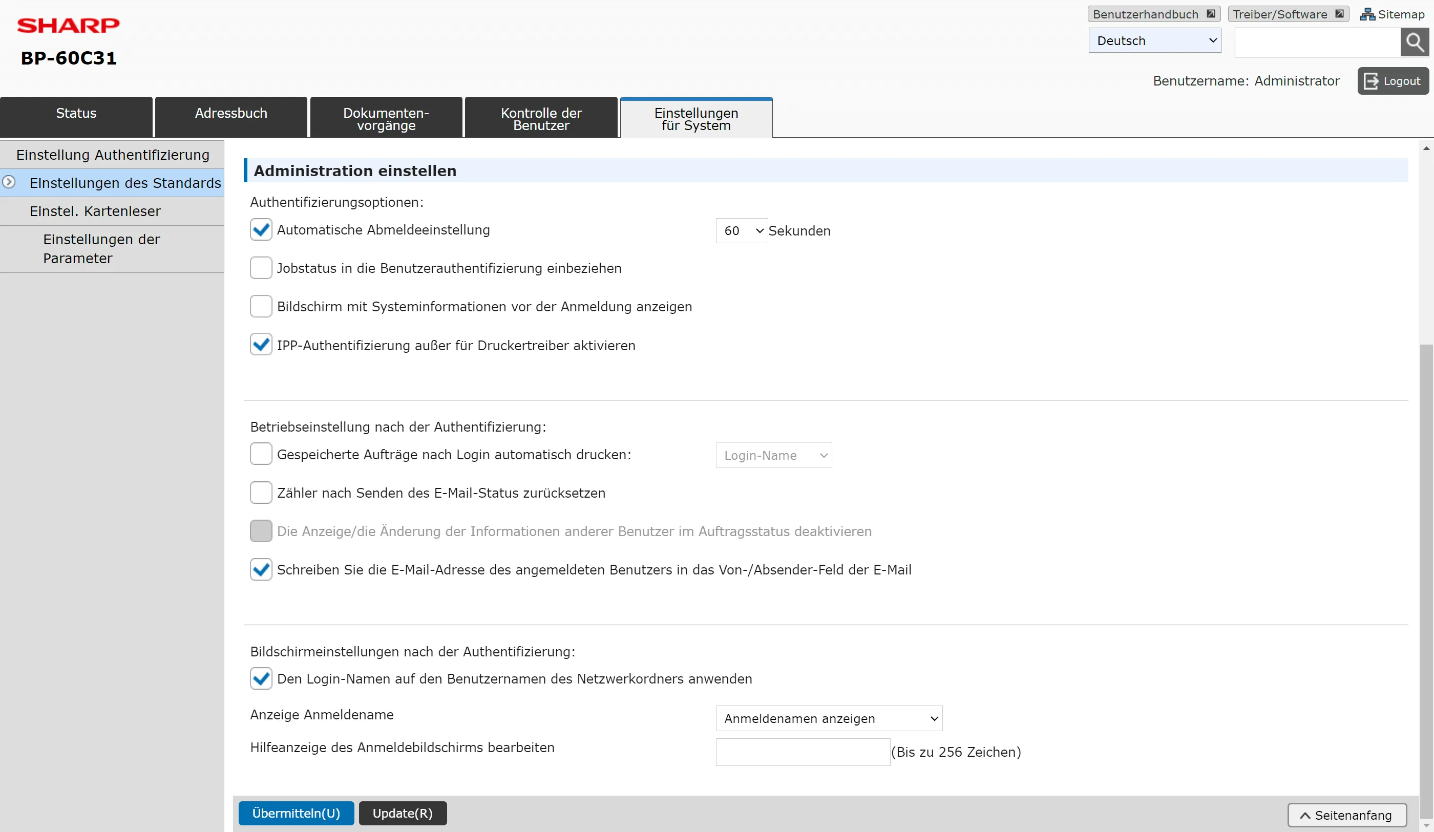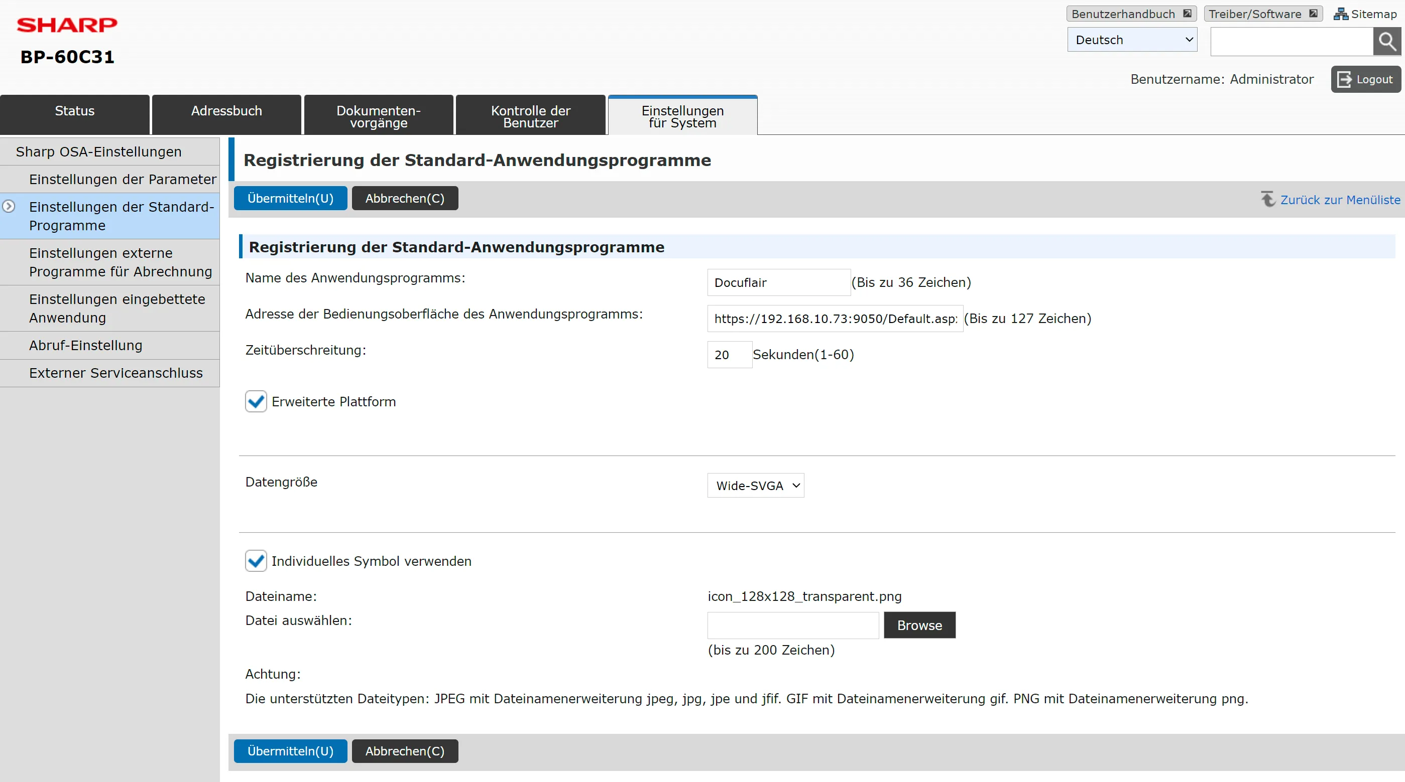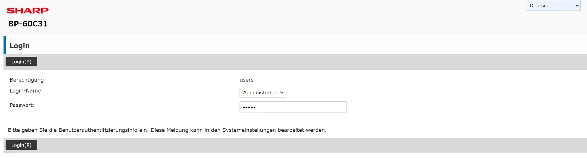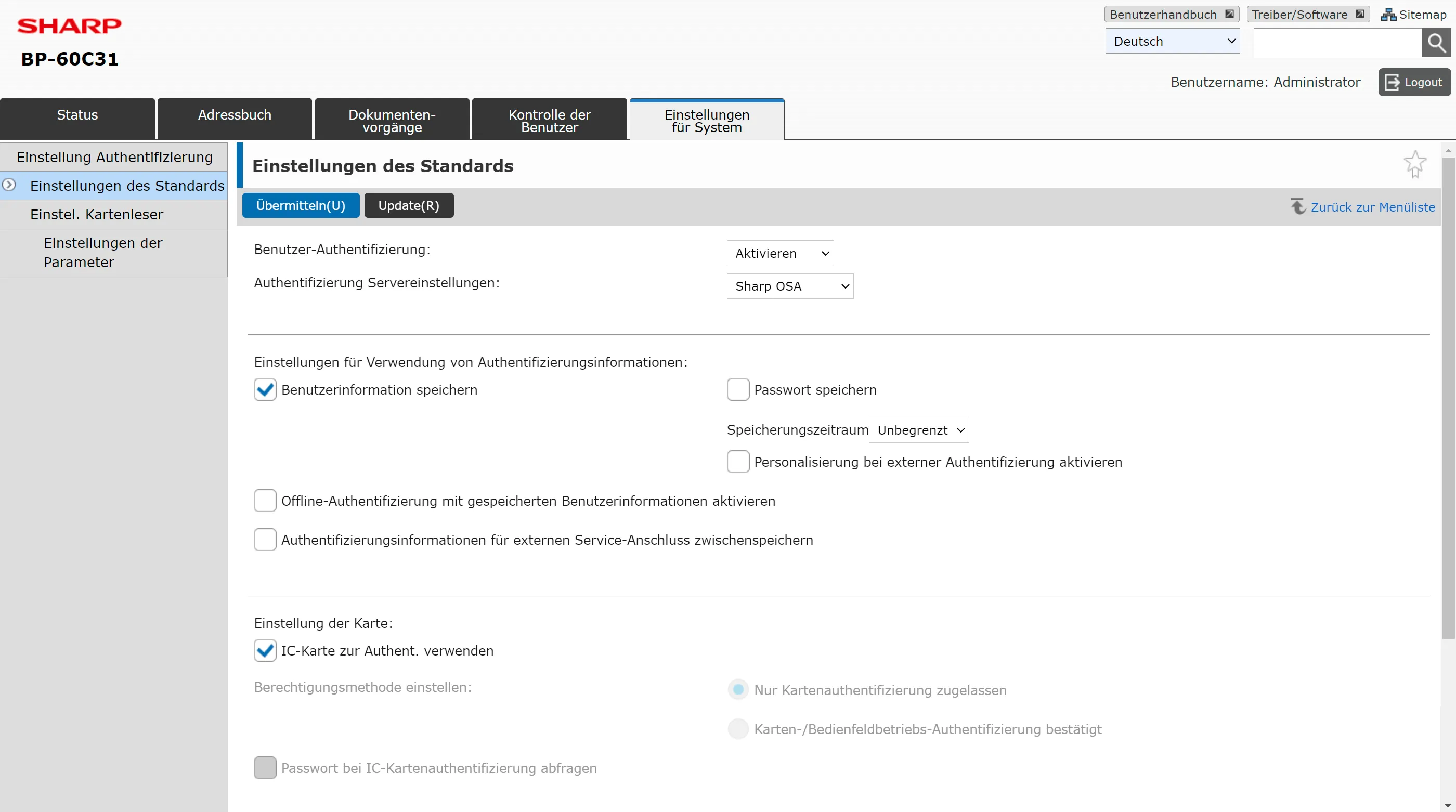 Nach erfolgreicher Anmeldung wird Ihnen die Startseite der Geräte-Webseite angezeigt. Navigieren Sie über den Menüpunkt Einstellungen für System zu den Sharp OSA Einstellungen.