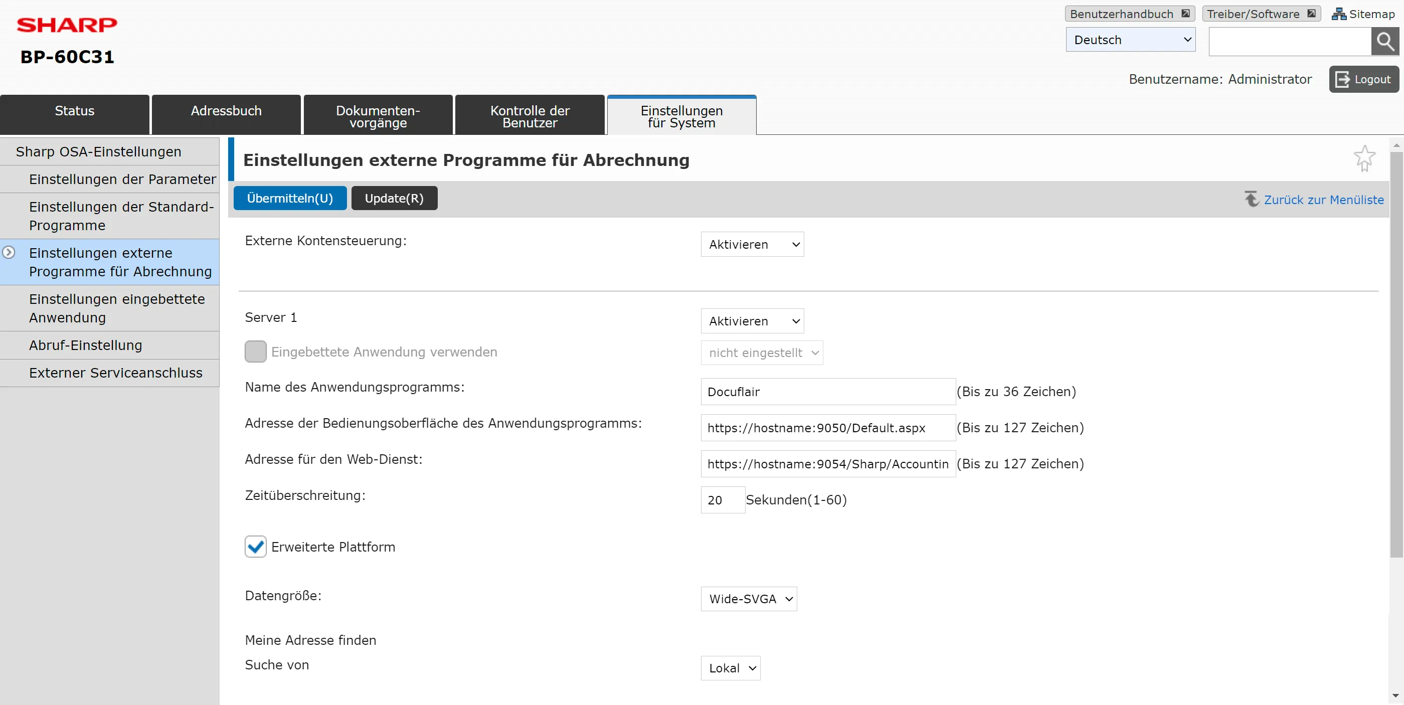- Adresse für den Web-Dienst (darf maximal 127 Zeichen lang sein): https://hostname:9054/Sharp/Accounting.asmx