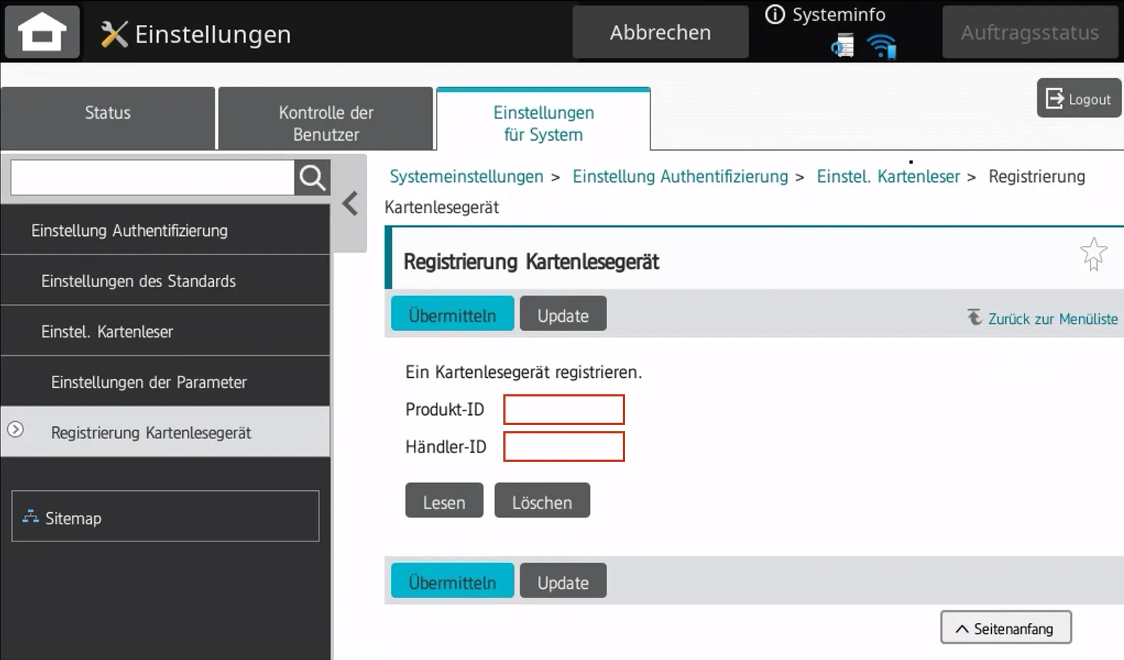 Um diese Einstellung zu überprüfen navigieren Sie direkt am Gerät zu Systemeinstellungen > Einstellungen Authentifizierung > Einstel. Kartenleser > Registrierung Kartenlesegerät. Vergewissern Sie sich, dass ein Kartenleser registriert wurde. Im rot markierten Bereich des Screenshots müssen Sie eine Produkt-ID und Händler-ID vorfinden. Stecken Sie gegebenfalls den Kartenleser erneut ab und nach kurzer Zeit wieder an und starten Sie dann das Gerät neu.