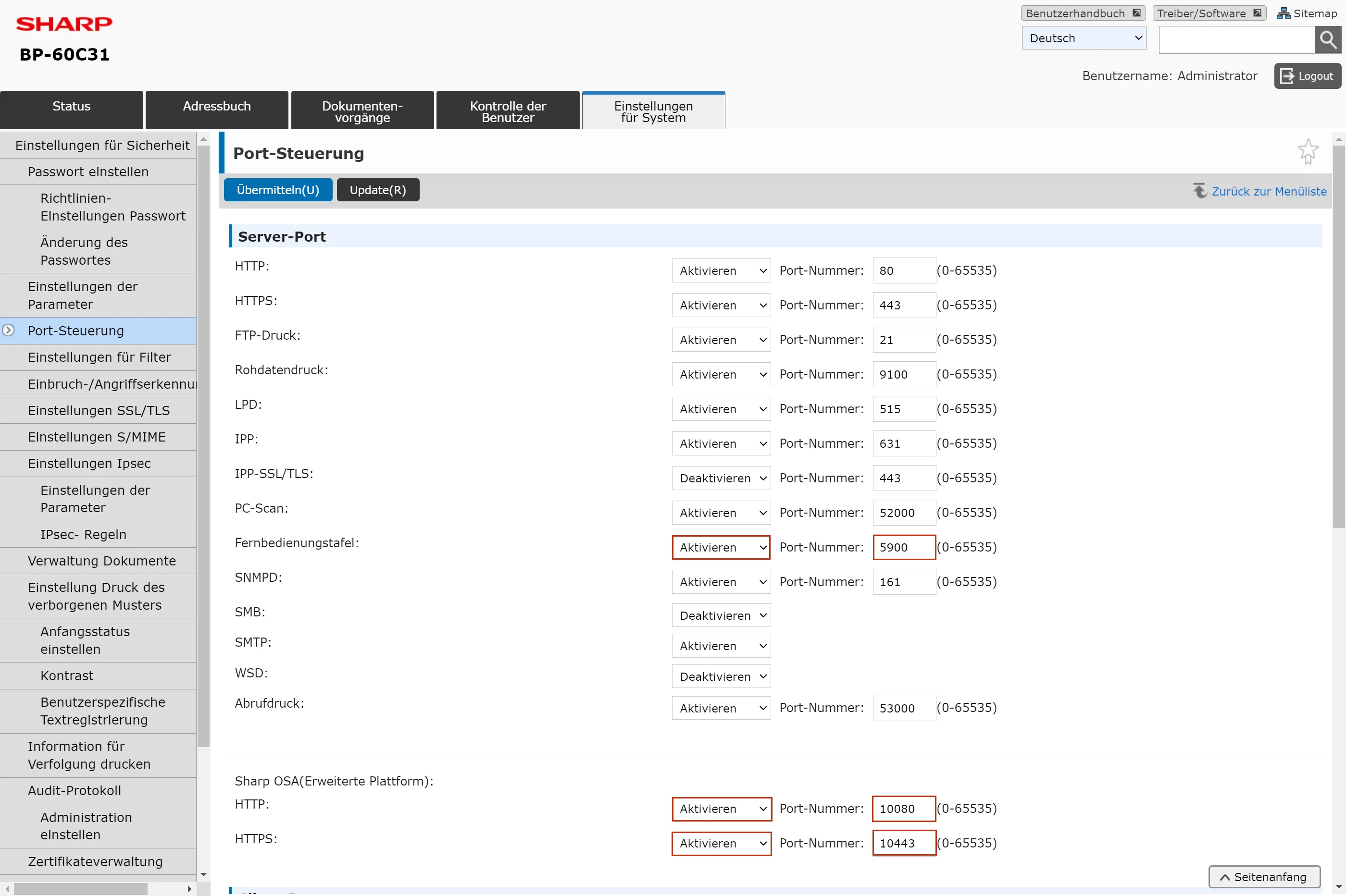 Vergewissern Sie sich auch, dass das Sharp OSA Protokoll aktiviert ist und dieses, wie auch der verwendete Port mit den im Docuflair Manager hinterlegten Sharp Geräteeinstellungen übereinstimmen.