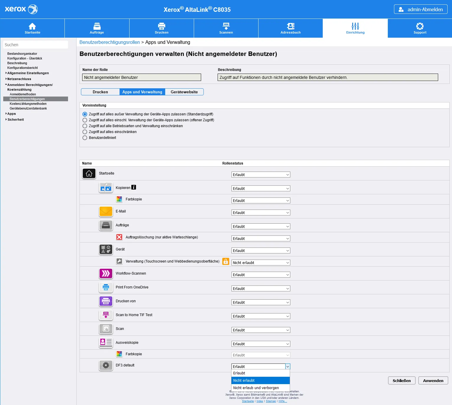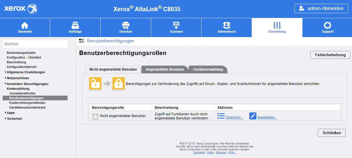 Auf dieser Seite muss nun Bearbeiten der Nicht angemeldeten Benutzer auswählt werden. Es öffnet sich nun eine Seite mit allen verfügbaren Anwendungen auf dem Multifunktionsdrucker.
