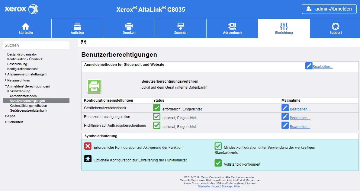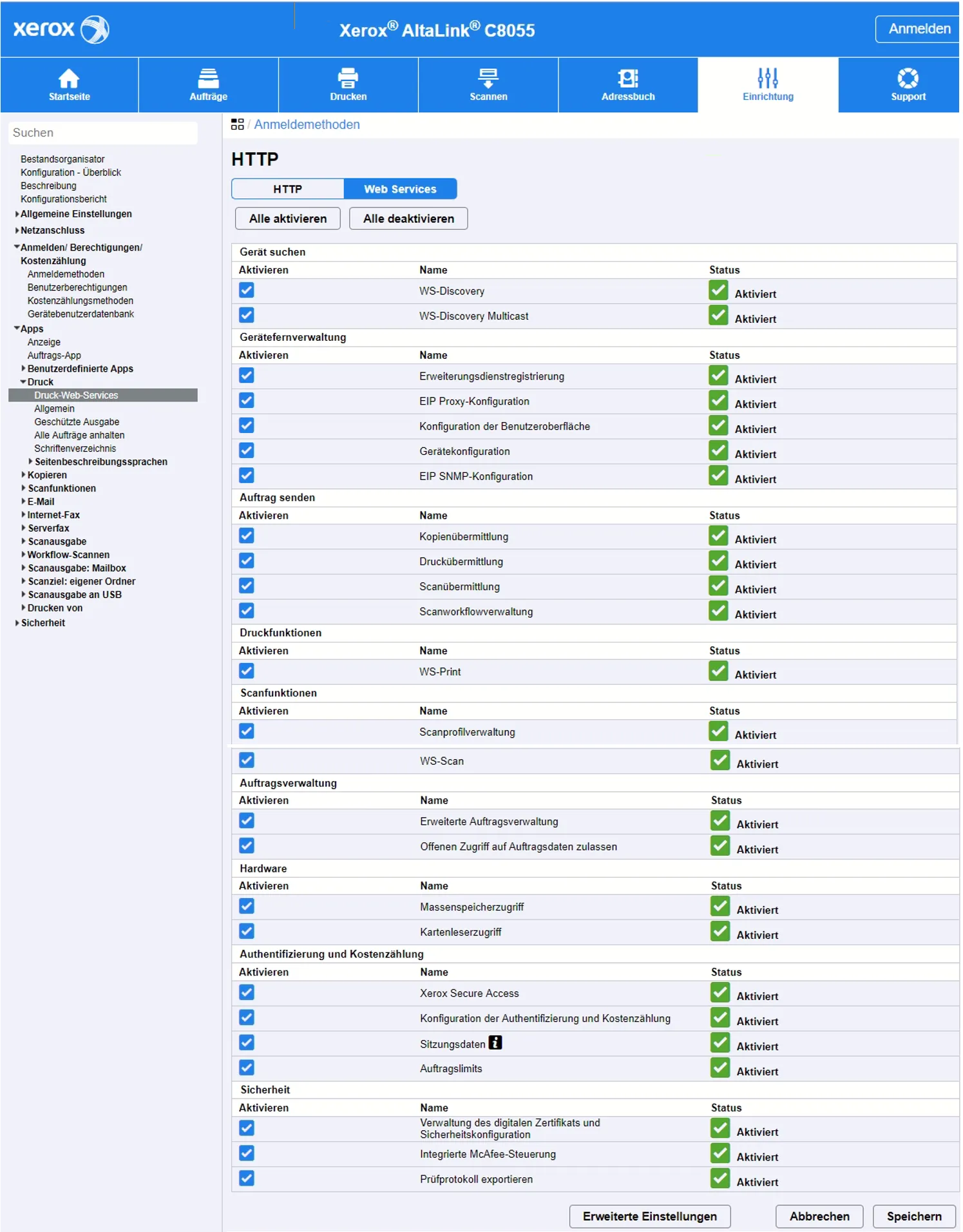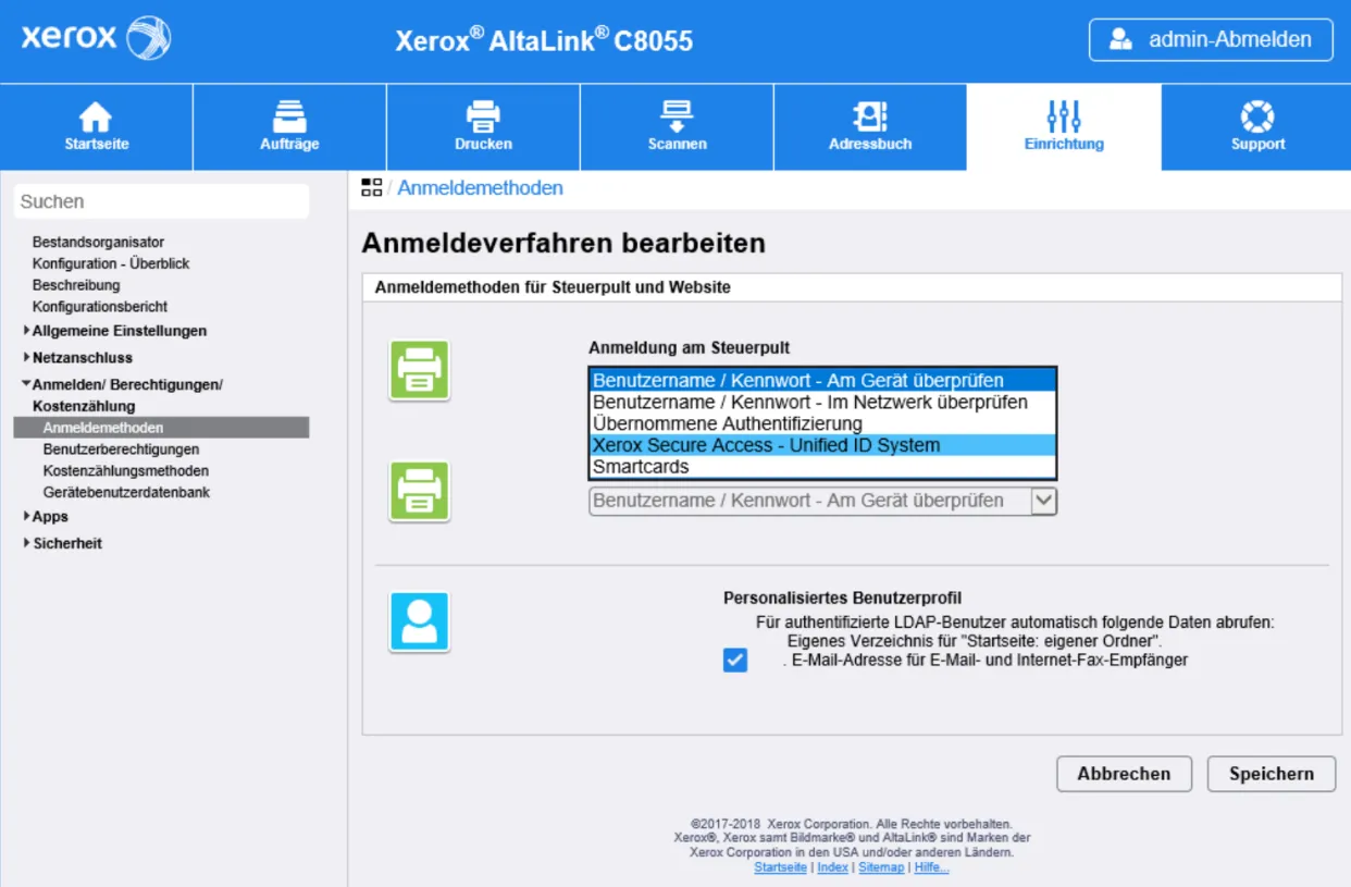 Das folgende Beispiel zeigt die Konfiguration auf einer Xerox AltaLink C8055. Im Wesentlichen sollten alle aktuellen Xerox Multifunktionsdrucker gleich oder ähnlich konfigurierbar sein.