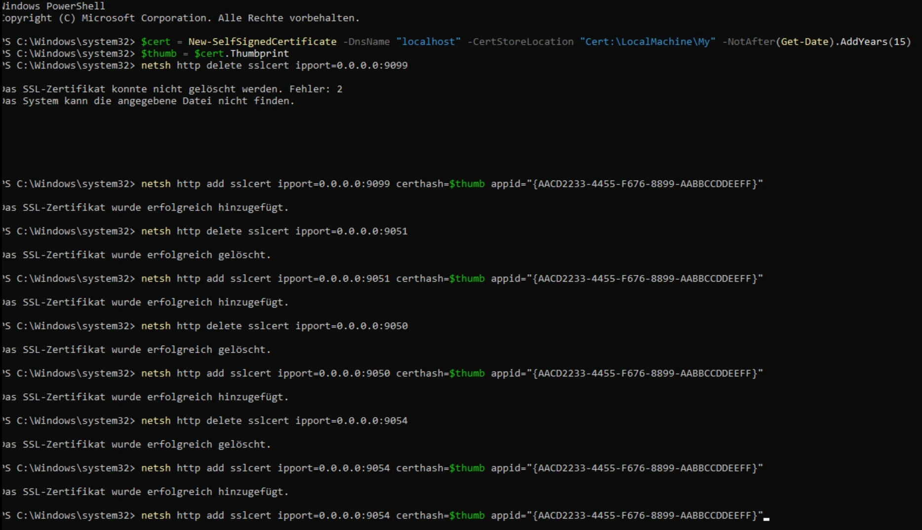 netsh http add sslcert ipport=0.0.0.0:443 certhash=$thumb appid="{00112233-4455-6677-8899-AABBCCDDEEFF}"