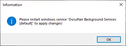 Schließen Sie die Log-Level Utility, nachdem Einstellungen verändert wurden, erhalten Sie eine Information. Diese besagt, dass Sie den Windows Service "Docuflair Background Services [default]" neu starten sollen, um die Änderungen zu übernehmen. Auch ein Neustart des Servers übernimmt die Änderungen.