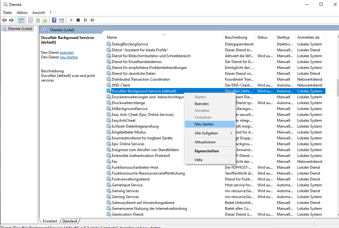 Damit Änderungen übernommen werden, müssen Sie vom Startmenü Dienste ausführen. In der Auflistung suchen Sie dann nach: "Docuflair Background Services [default]", drücken rechtsklick darauf und wählen Neu starten. Sollten Sie eine Konfiguration mit dem "Internet Information Server" verwenden, muss dieser ebenfalls neu gestartet werden.