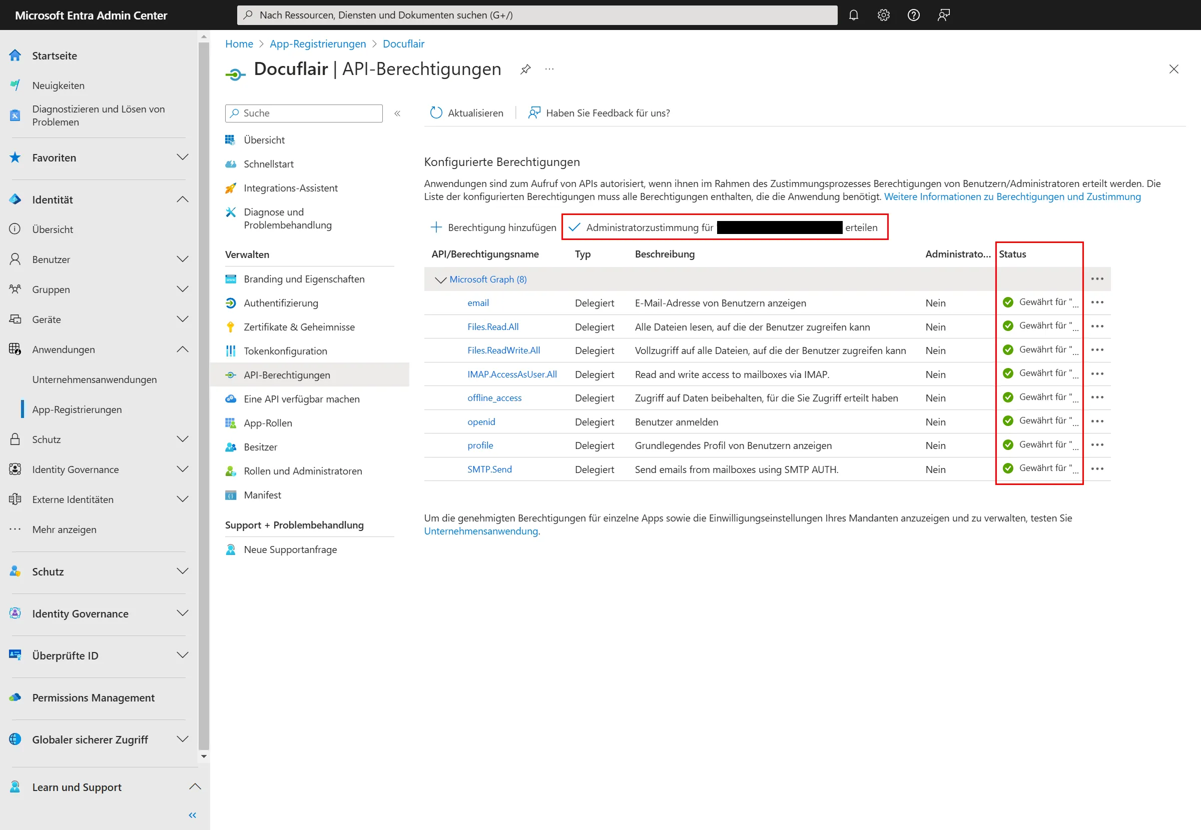 Abschließen werden die hinzugefügten Berechtigungen angezeigt. Je nach Unternehmenseinstellung kann es notwendig sein, dass die Administratorzustimmung für das Unternehmen erteilt werden muss.