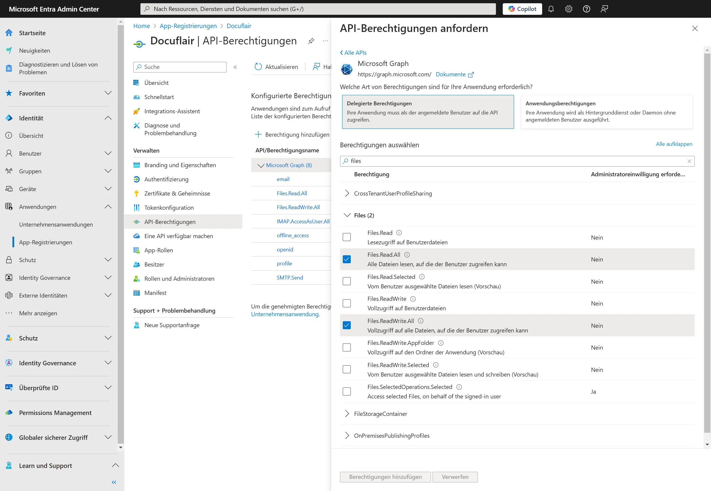 | Files.Read.All | Ermöglicht das lesen von Dateien. Application permissions (granted by administrators) für SharePoint Site Collections |