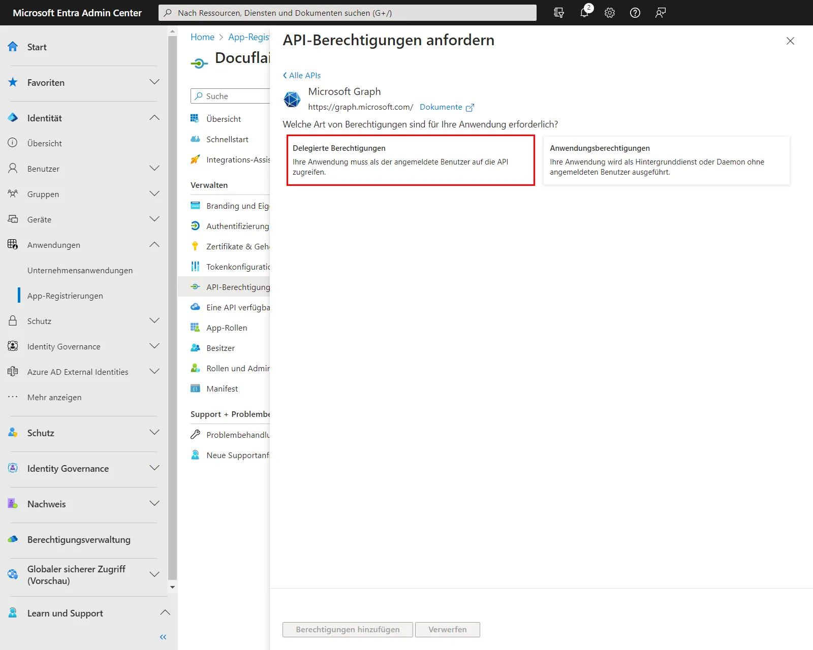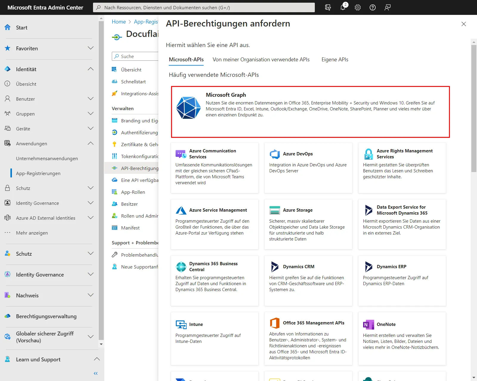 Es werden nur Berechtigungen vom Typ Microsoft Graph unter dem Reiter Microsoft-APIs benötigt.