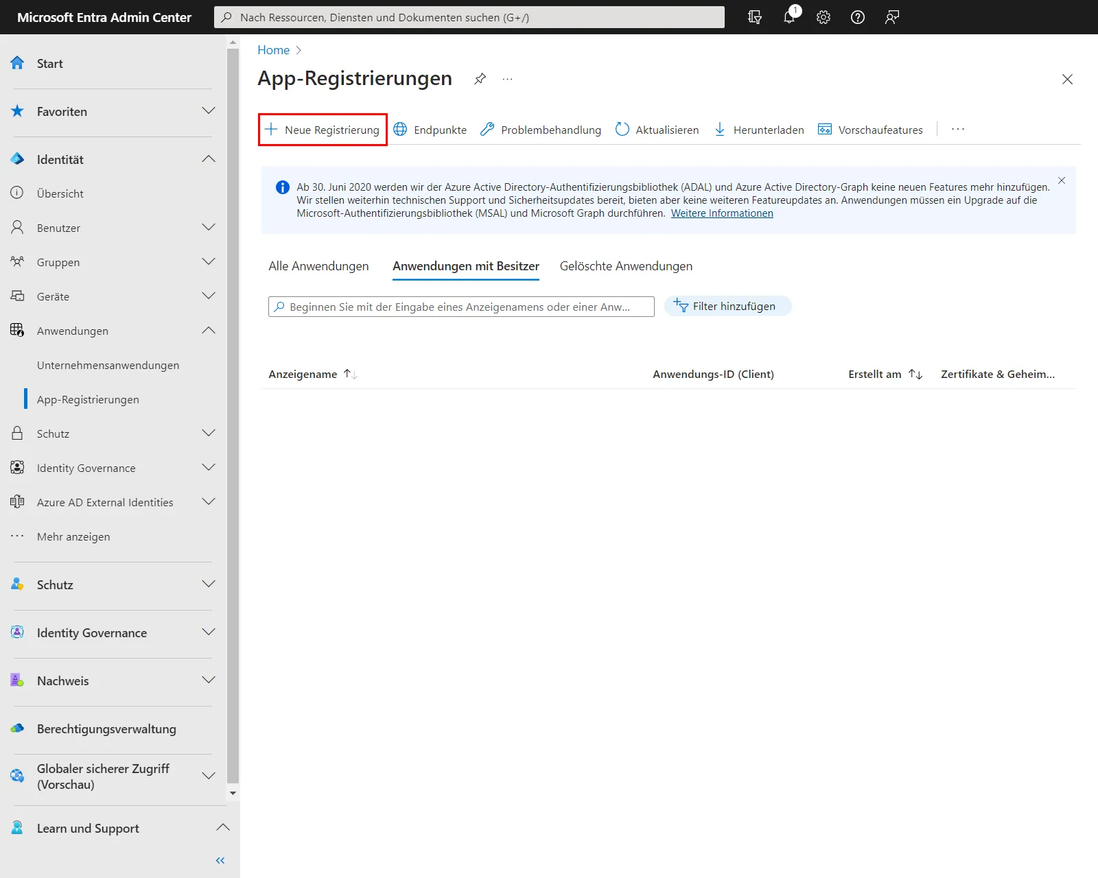 Im ersten Schritt wird eine neue Anwendung registriert. Dazu muss im Menü auf der linken Seite wie folgt navigiert werden: Anwendungen > App-Registrerungen.