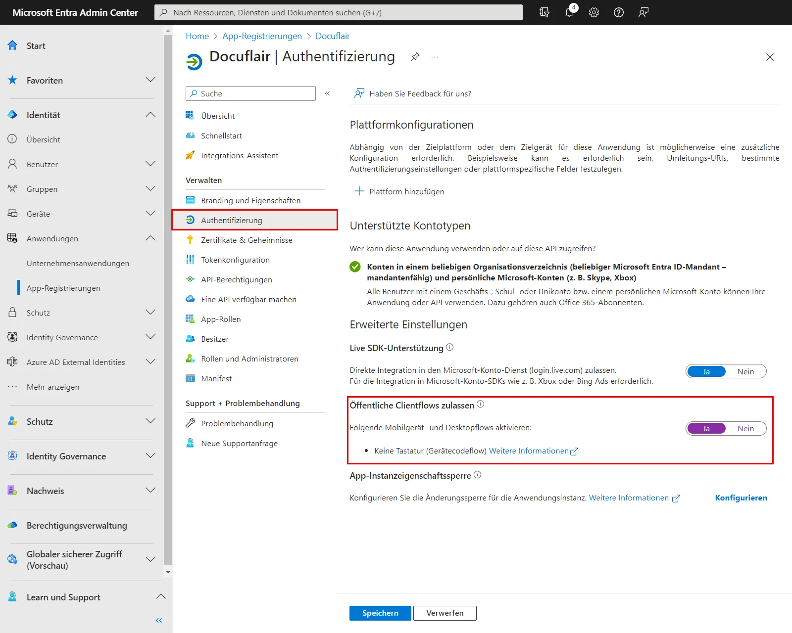 Unter Öffentliche Clientflows zulassen muss der Schalter auf Ja gesetzt werden.
