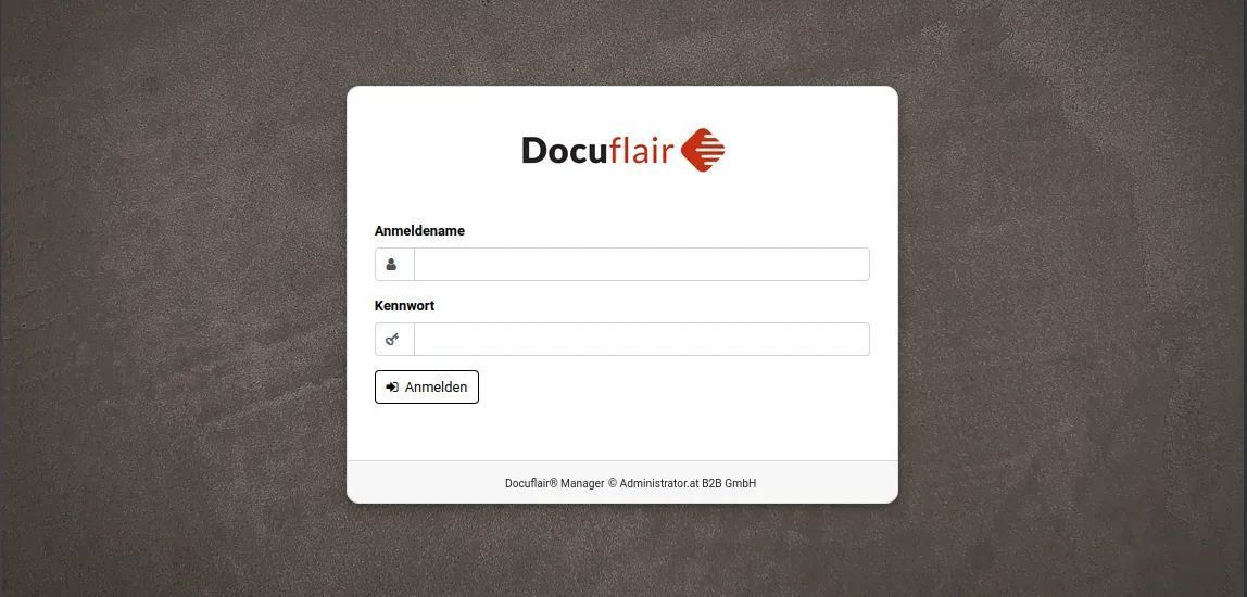 Der Docuflair Manager ist die zentrale Verwaltungsoberfläche, die im Webbrowser geöffnet wird. Hier werden alle Einstellungen vorgenommen — von der Geräteverwaltung über Workflows bis zu Benutzerrechten. Die Anmeldung erfolgt mit Benutzername und Kennwort.