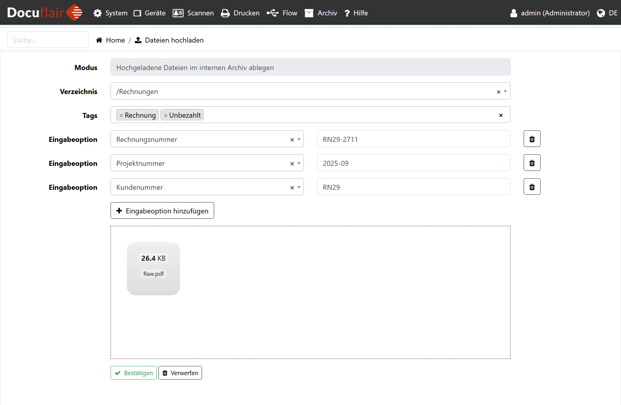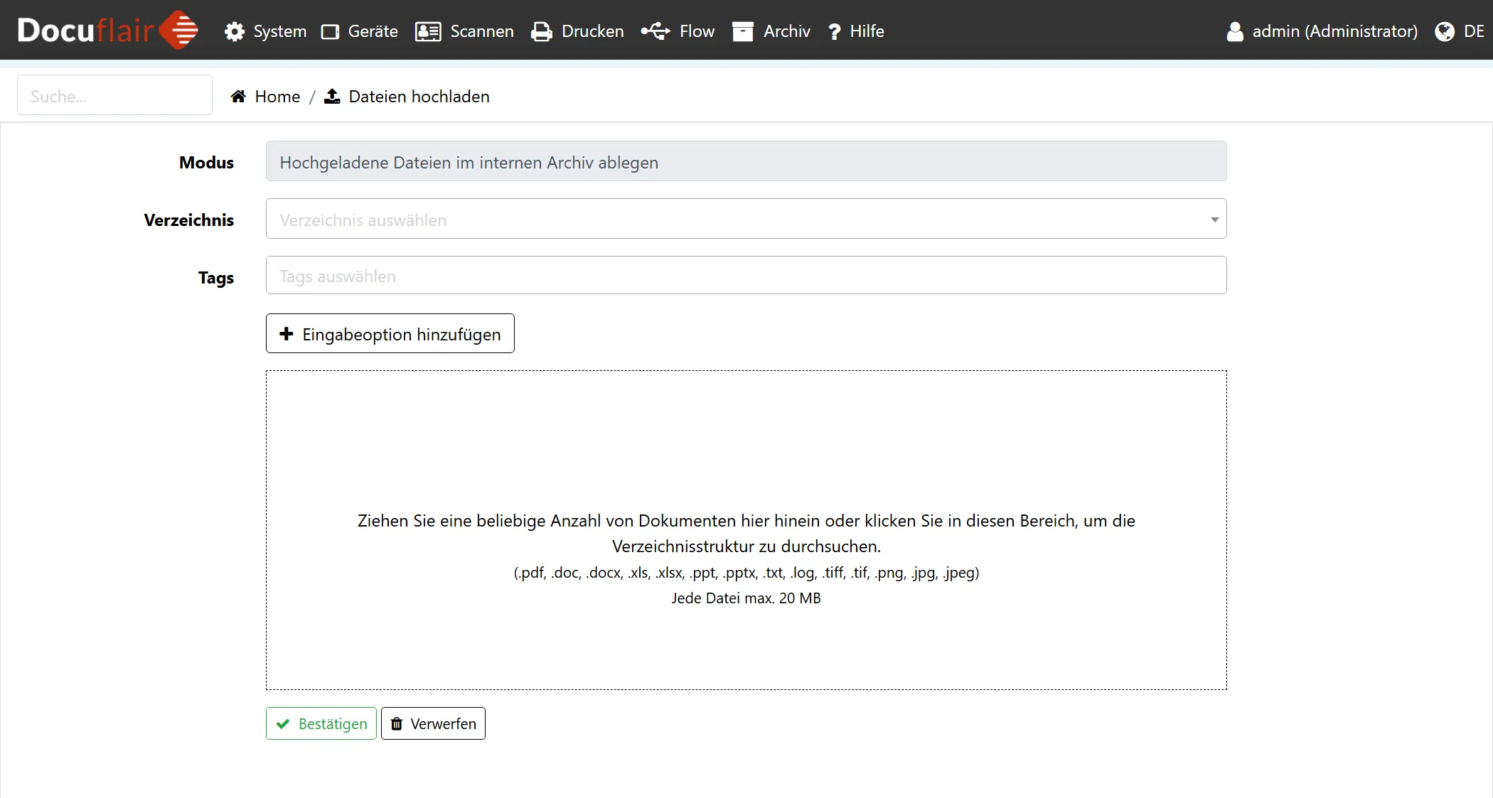 In den Archiv Einstellungen können Sie definieren, welche Dateiformate hochgeladen werden dürfen. Sie können Dokumente sowohl einzeln als auch im Stapel hochladen.