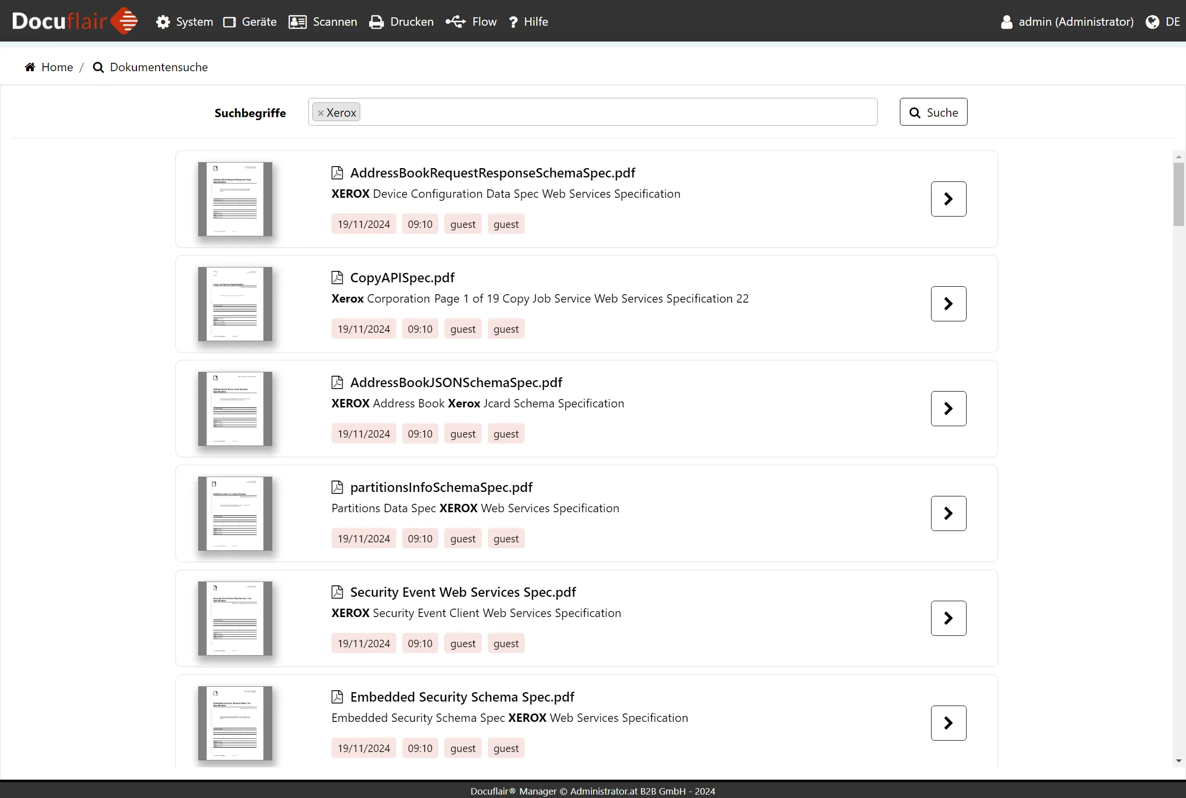 Die Suchergebnisse werden in einer Listenansicht angezeigt. Durch Klick auf ein Dokument wird die Dokumentenansicht geöffnet.