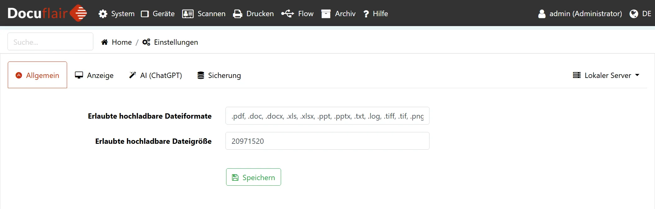 | Erlaubte Dateiformate | Kommagetrennte Liste der erlaubten Dateierweiterungen für den Upload (z.B. .pdf, .doc, .docx, .xls, .xlsx, .ppt, .pptx, .txt, .log, .tiff, .tif, .png, .jpg, .jpeg). |