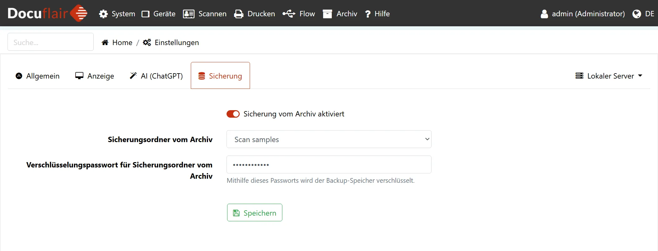 Ab der Docuflair | Archive Professional Lizenz haben Sie die Möglichkeit, das Archiv in einem zusätzlichen Speicherort automatisch zu sichern. Aktivieren Sie hierfür die Sicherungsfunktion und definieren Sie den Speicherort für die Ablage sowie das Kennwort, mit dem Ihre Daten verschlüsselt werden sollen.