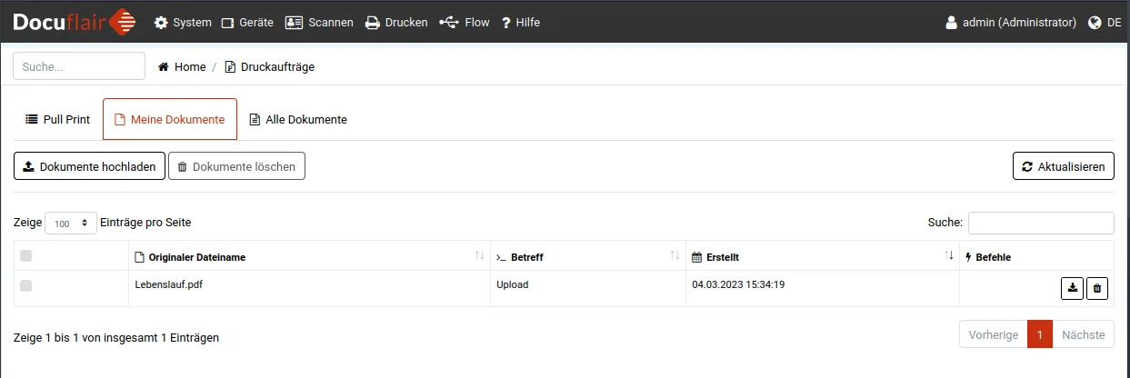 Ein angemelderter Benutzer kann dabei nur auf eigene Dokumente zugreifen. Mit dem Papierkorb Symbol in der rechtesten Spalte (Befehle) können Dokumente gelöscht werden, mit dem Pfeil Symbol können Dokumente heruntergeladen werden.