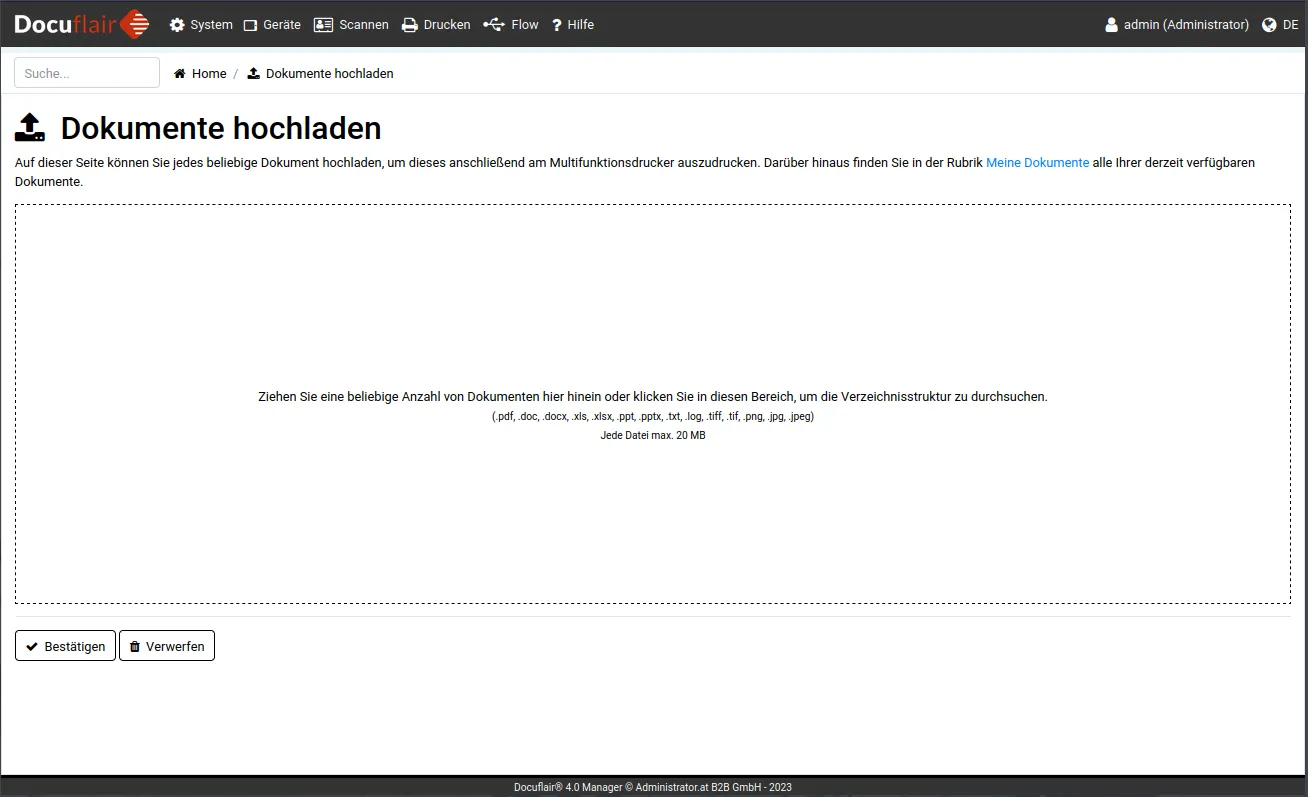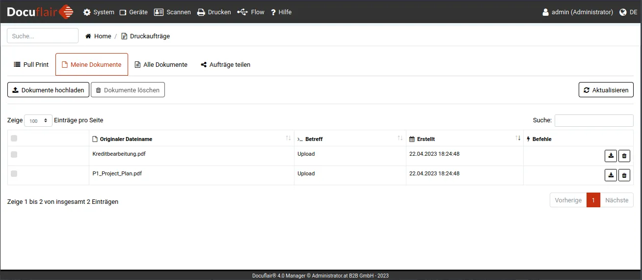 Im Menü unter Drucken/Druckaufträge/Meine Dokumente werden alle Dokumente aufgelistet, welche von diesem Gerät hochgeladen wurden. Sie können hier Dokumente hochladen, um diese mit Docuflair bearbeiten zu können. Hochgeladene Dokumente können jederzeit gelöscht oder heruntergeladen werden.