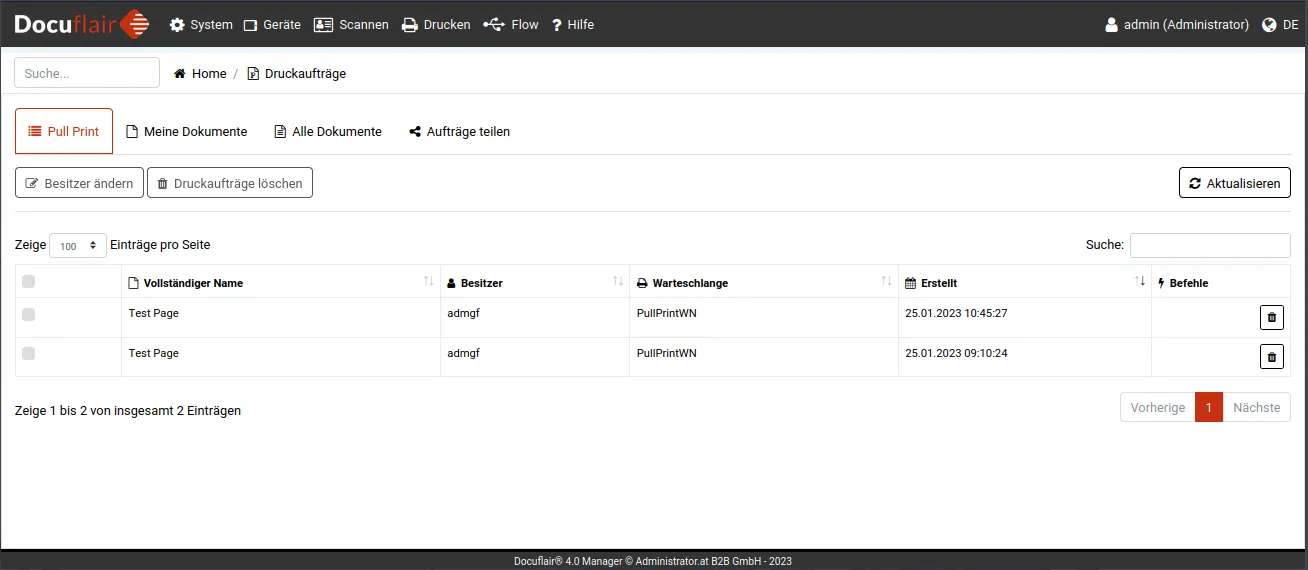 Druckaufträge sind Dokumente, die zum Drucken an Docuflair gesendet wurden. Unter „Druckaufträge" können Administratoren alle wartenden Aufträge einsehen, Benutzern zuweisen oder löschen. Benutzer können hier auch eigene Dokumente hochladen, um sie über Docuflair drucken zu lassen.