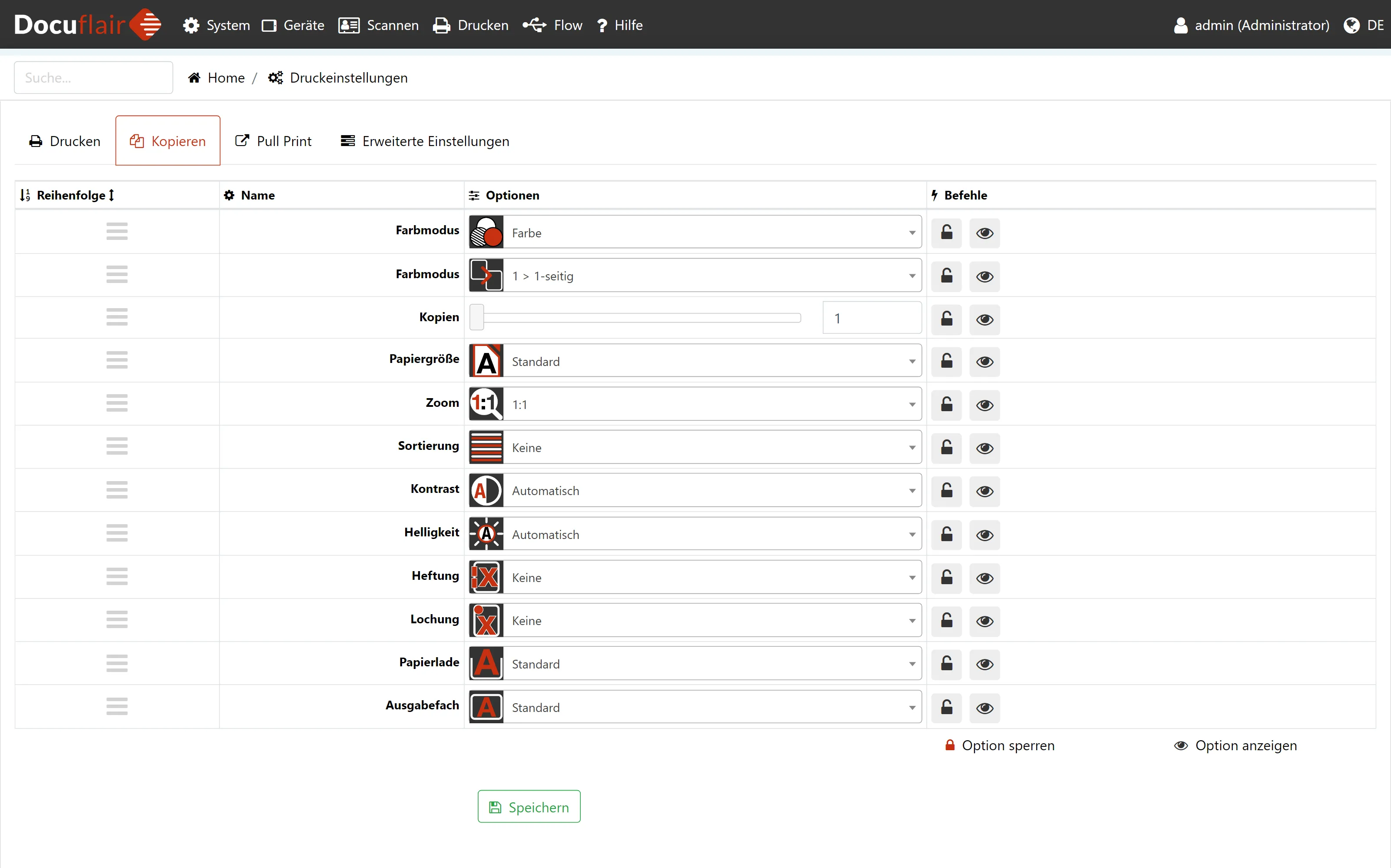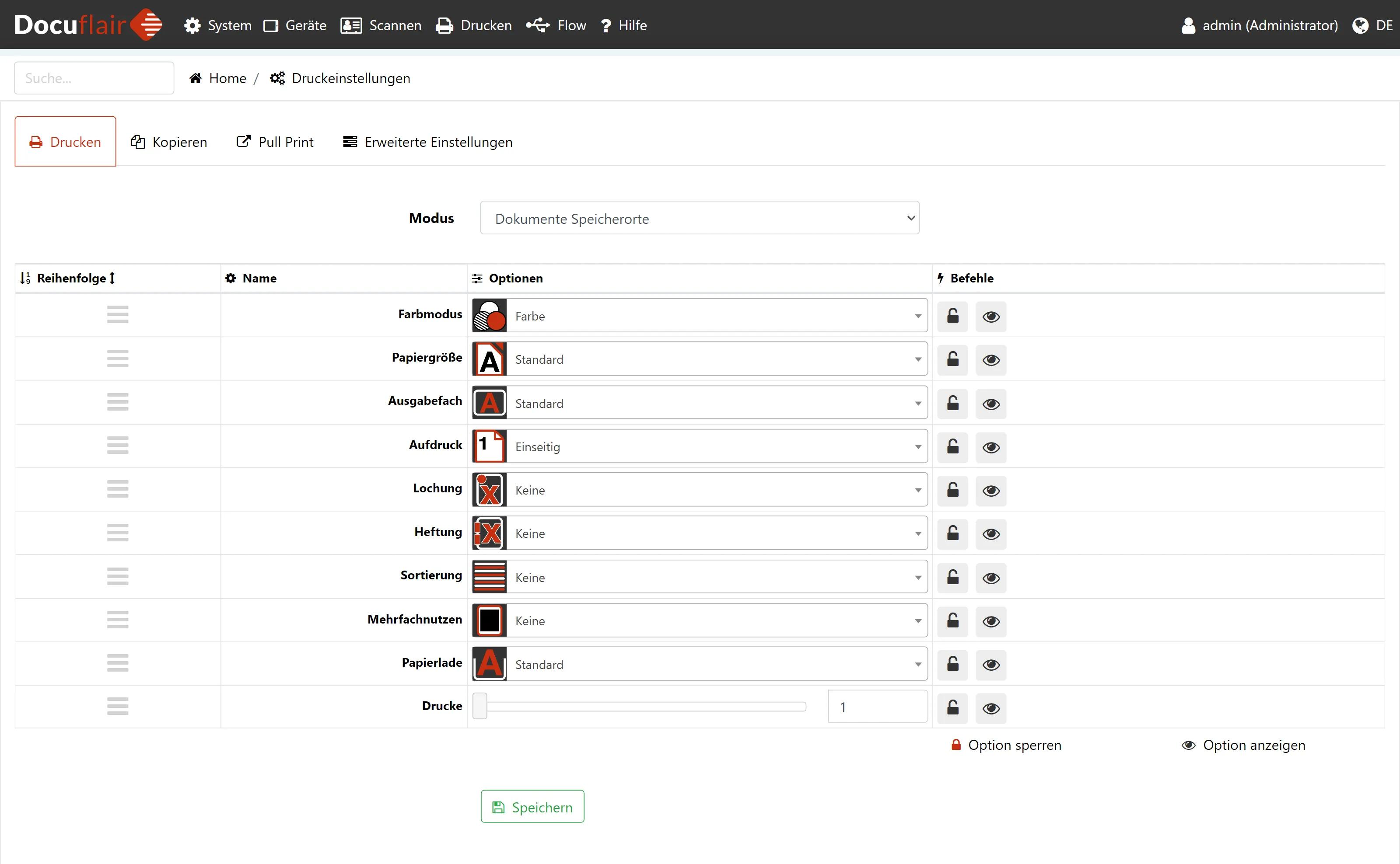 Die Druckeinstellungen legen die Standardwerte fest, die für verschiedene Druckarten gelten — z.B. beim Drucken von Dokumenten aus Speicherorten, E-Mails, Fotos oder Pull Print. Hier können auch die Kopier-Einstellungen und erweiterte Optionen wie die Raspberry-Pi-Anbindung konfiguriert werden.