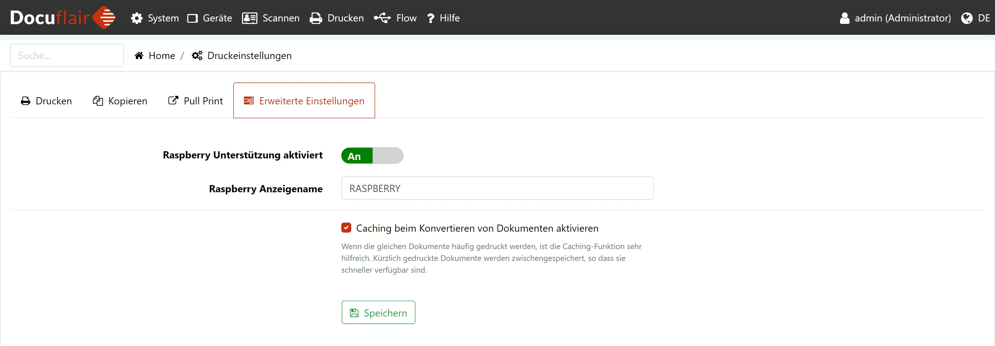 Zum Aktivieren der Raspberry Pi Unterstützung muss aus dem Startmenü des Docuflair Managers system/Standardeinstellungen und anschließend Erweiterte Einstellungen ausgewählt werden.