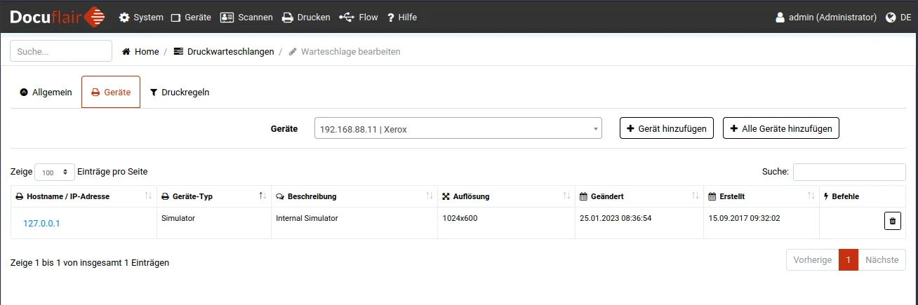 Kommt ein Auftrag in den Eingabedrucker, so wird dieser vom Docuflair Manager abgeholt und verarbeitet. Wurde der aktuelle Benutzer noch nicht im Docuflair Manager angegeben, so wird der Auftrag gelöscht. Ansonsten erscheint der Auftrag unter Drucken/Druckaufträge mit zugehörigem Benutzer und Warteschlange. Um den Auftrag auf einem Gerät sichtbar zu machen, muss das gewünschte Gerät der Warteschlange hinzugefügt werden.
