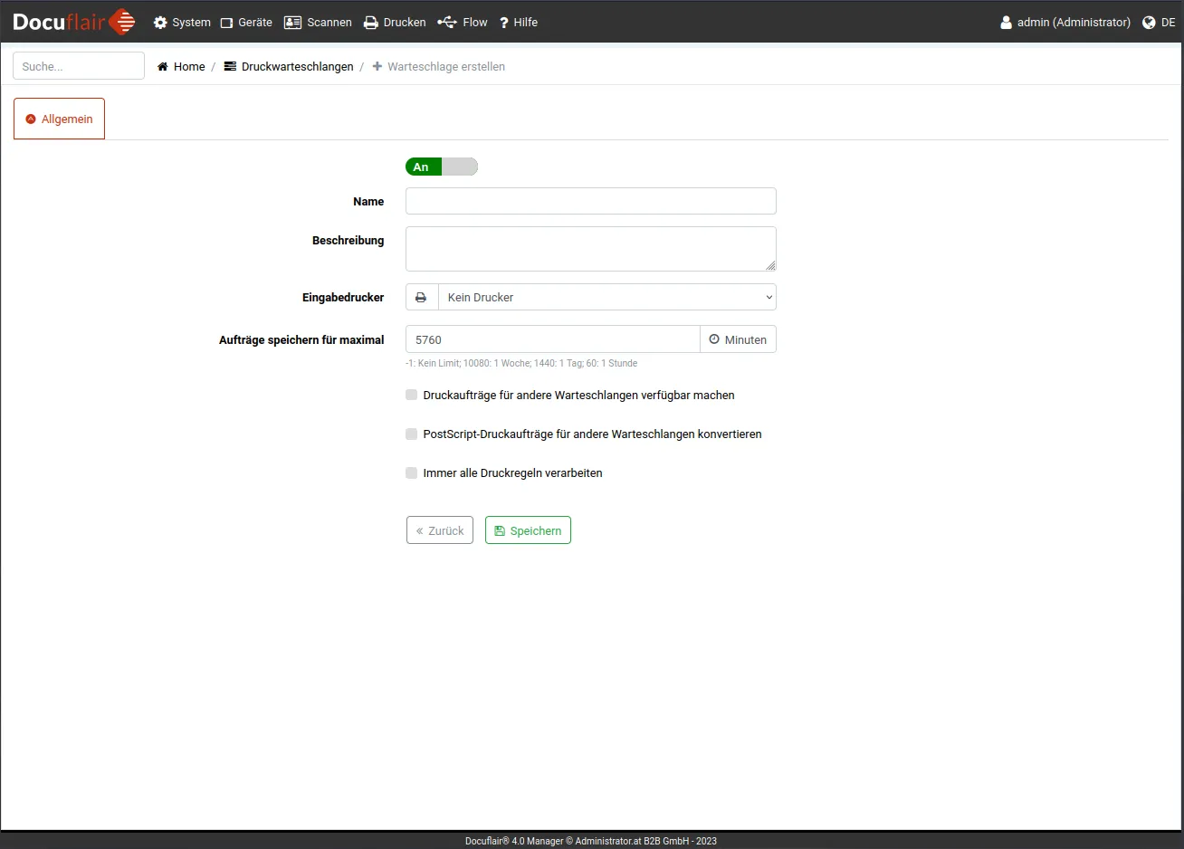 Eine neue Warteschlange kann mittels dem + Warteschlange erstellen Knopf erstellt werden. Neben dem Namen und einer Beschreibung kann auch ein Eingabedrucker ausgewählt werden. Der Eingabedrucker dient als Datenquelle für die Warteschlange. Bei Aufträge speichern für maximal lässt sich die Lebensspanne eines Auftrags innerhalb der Warteschlange in Minuten angeben, nach dieser Zeit wird der Auftrag gelöscht.