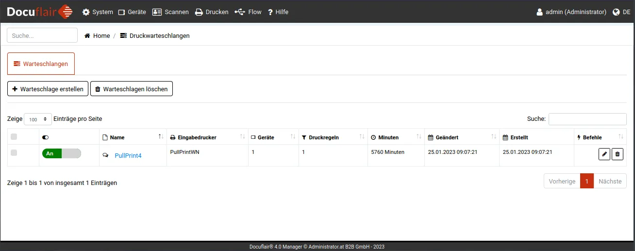 Druckwarteschlangen sind in Docuflair ein Tool, welches beispielsweise zur Verwaltung der Warteschlangen mit Pull Print-Funktion dient. Einer Warteschlange können Geräte zugewiesen werden und es können auch mehrere Druckregeln definiert werden.