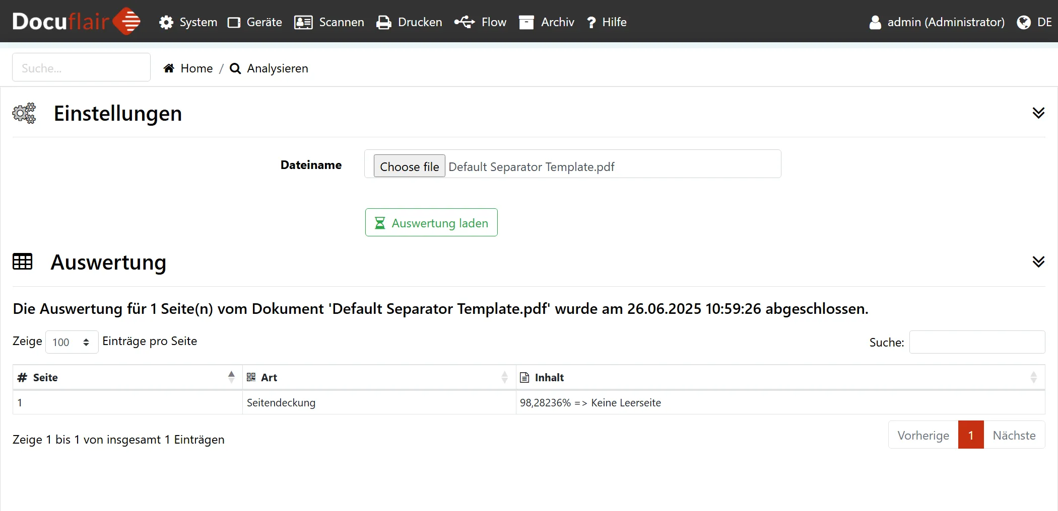 Das Dokument wird durchsucht und auf verschiedene Merkmale geprüft. Unter anderem der Weißanteil, also ob es sich um eine Leerseite handelt. Des weiteren wird eine Erkennung von Barcodes und QR-Codes durchgeführt und die Ergebnisse werden in der Auswertung angezeigt.