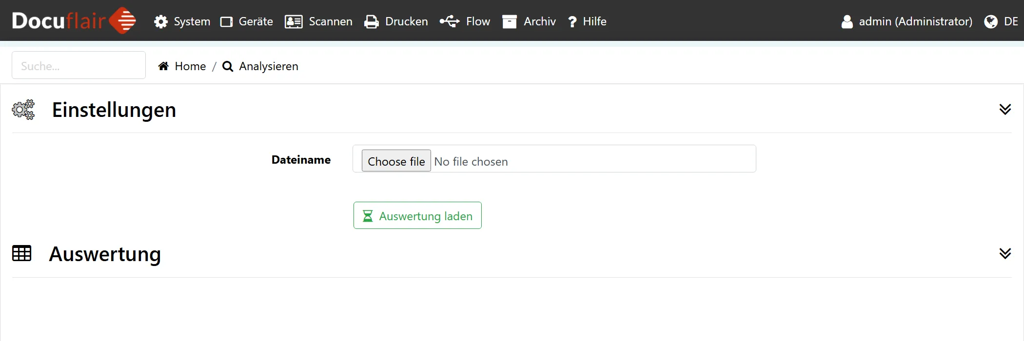 Die Dokumentenanalyse zeigt Ihnen im Detail, wie Docuflair ein bestimmtes Dokument verarbeitet hat — welche Barcodes erkannt wurden, welche OCR-Ergebnisse vorliegen und welche Metadaten extrahiert wurden. Das ist hilfreich, um Workflows zu testen und Fehler in der Erkennung zu finden.