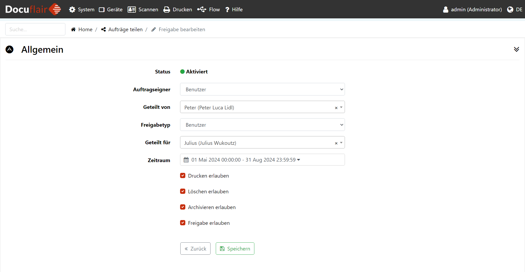 Erstellt man eine Freigabe so werden alle Dokumente des aktuellen Benutzers entsprechend dem ausgewählten Freigabetypen für den Benutzer freigegeben, welcher bei Geteilt für ausgewählt ist. Hierbei kann ein Zeitraum bestimmt, sowie die Rechte für das Drucken oder Löschen vergeben werden.