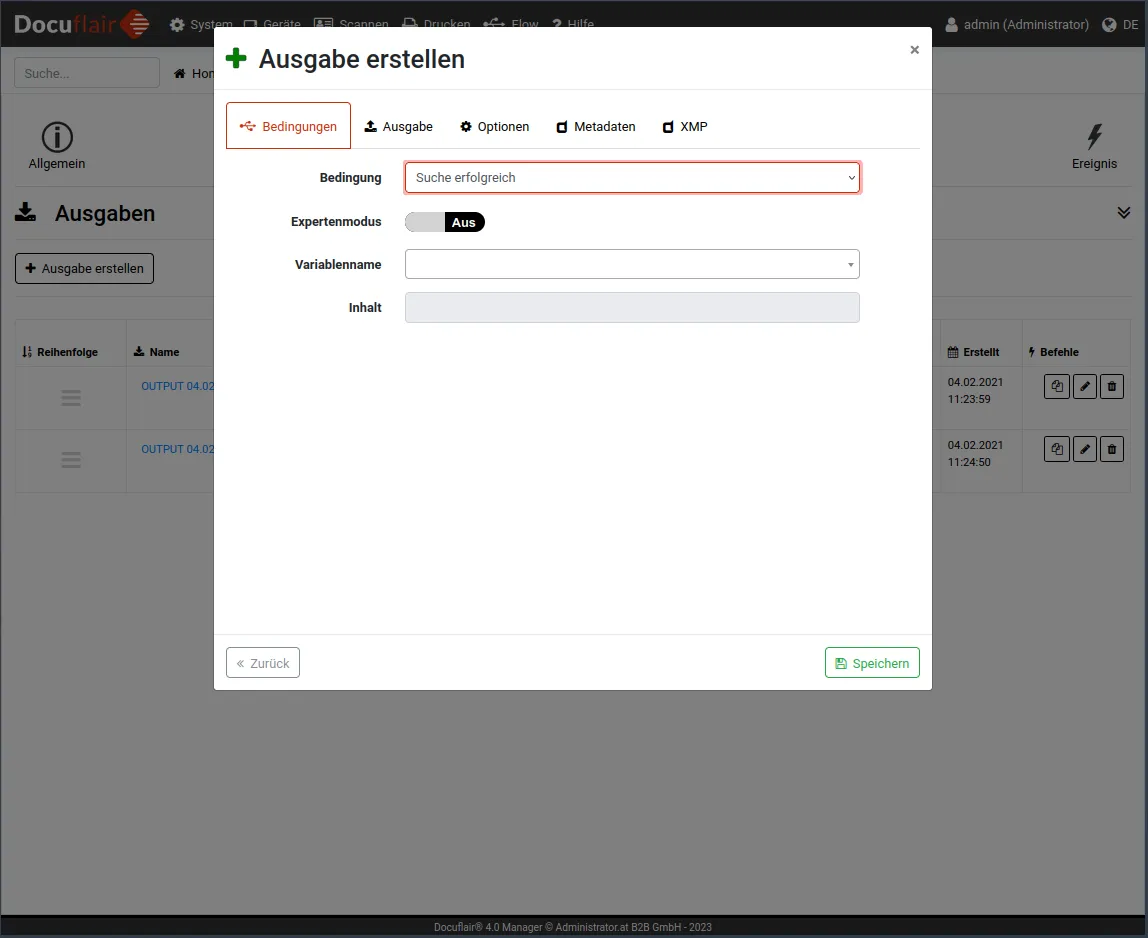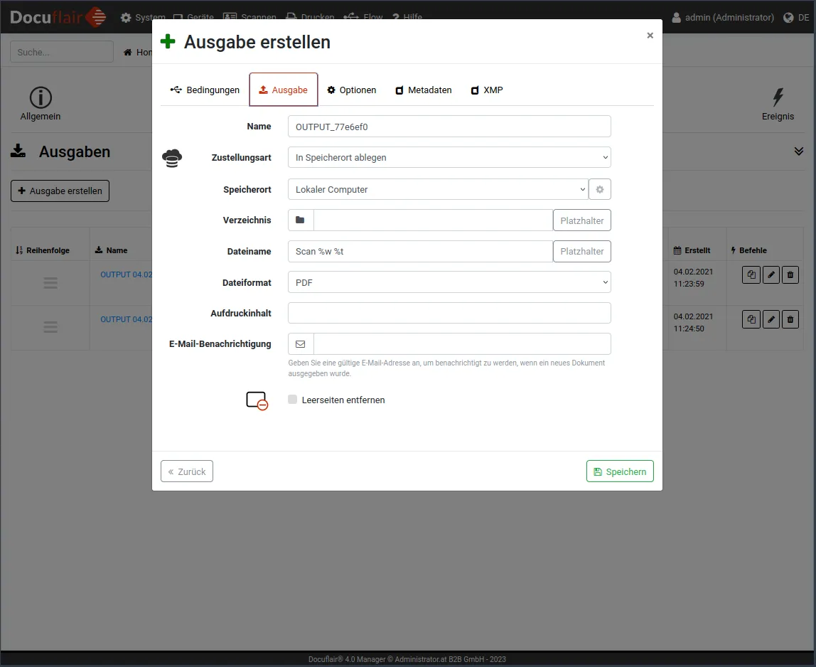 Die Ausgabe bestimmt, was am Ende eines Workflows mit dem gescannten Dokument passiert — z.B. in welchem Ordner es gespeichert wird, ob es per E-Mail verschickt wird oder welches Dateiformat verwendet wird. Sie können mehrere Ausgaben definieren und mit Bedingungen verknüpfen, sodass z.B. Rechnungen automatisch in einem anderen Ordner landen als Lieferscheine.