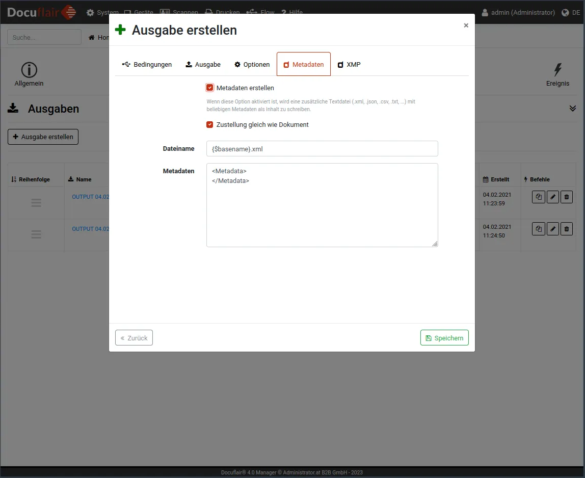 Mit dieser Option können Metadaten direkt in die Ausgabedatei eingebettet werden (z.B. in die PDF-Eigenschaften). Dies ist nützlich, wenn nachgelagerte Systeme die Metadaten direkt aus der Datei auslesen sollen.