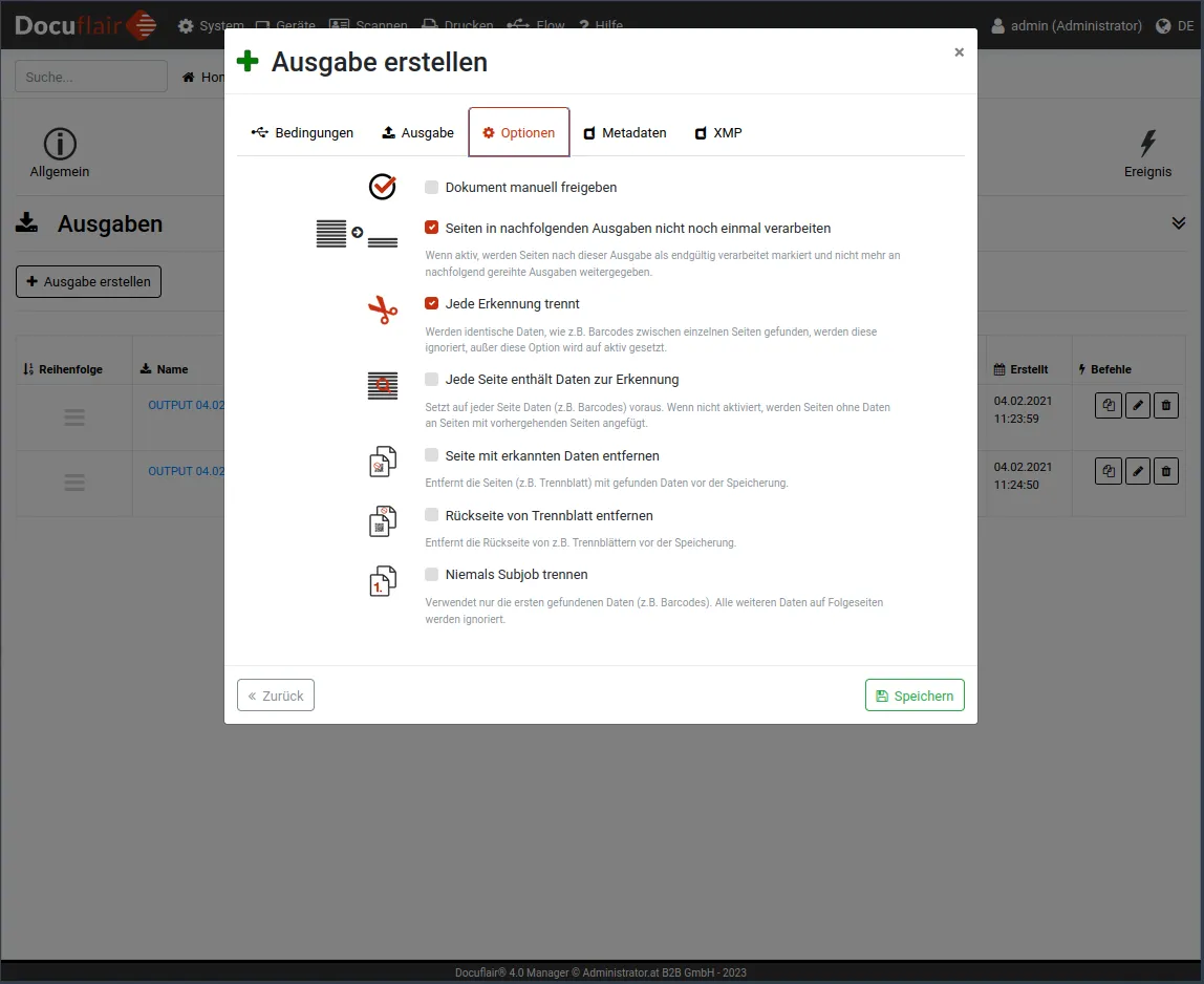 Die Ausgabe von gescannten Schritten stellt den letzten Verarbeitungsschritt in der Verarbeitung von gescannten Dokumenten dar, wobei die Ausgabe ein Bedingungen geknüpft werden kann, die auf Erkennungen von Dokumenteninhalten (Text, Barcodes oder Formulartyp) oder auf Metadaten (zum Beispiel: wer hat gescannt, auf welchem Gerät wurde gescannt, etc.) zurückgreifen können.