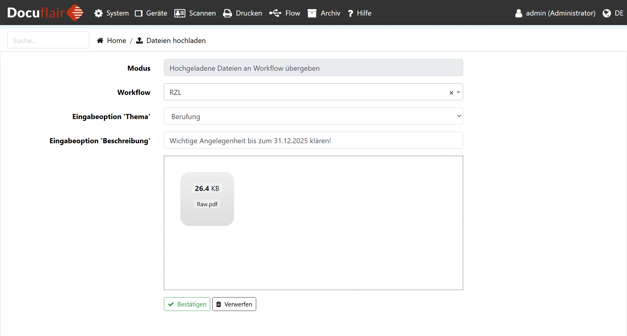 Wenn Sie digital vorliegende Dokumente an einen Workflow übertragen möchten, so steht Ihnen unter anderem der webbasierte Uploadbereich zur Verfügung. Bereits beim Hochladen haben Sie die Möglichkeit den Workflow und notwendige Metadaten mitzugeben.
