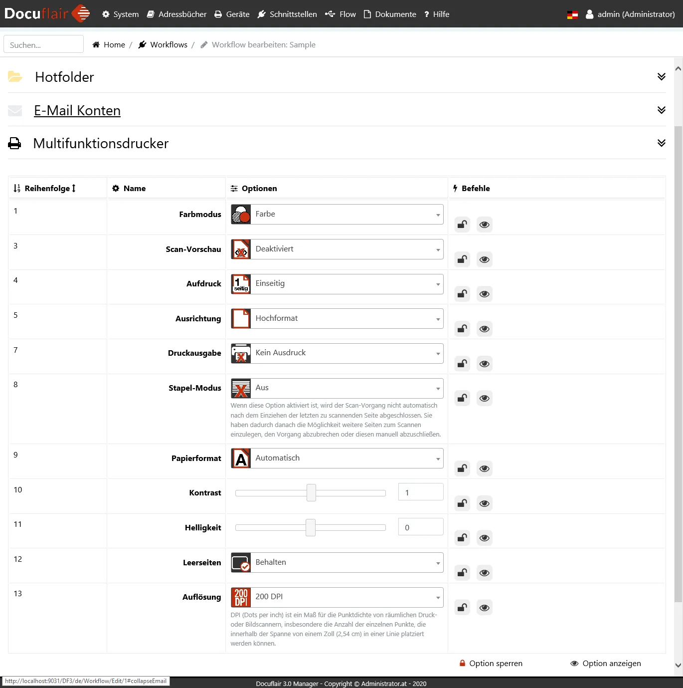 Wird ein Workflow auf einem Multifunktionsgerät angezeigt, können verschiedene Standardwerte für die Scan-Einstellungen hinterlegt werden. Diese Einstellungen dürfen sich von Workflow zu Workflow unterscheiden und sollen verhindern, dass Anwender falsche oder fehlerhafte Einstellungen auswählen können. In der Spalte Befehle kann mit dem "Schloss" festgelegt werden, ob ein Anwender am Multifunktionsdrucker berechtigt ist, eine eigene Einstellung vorzunehmen. Durch Anklicken des "Auges" ist es möglich, Einstellmöglichkeiten vor dem Anwender am Multifunktionsdrucker ganz zu verbergen.