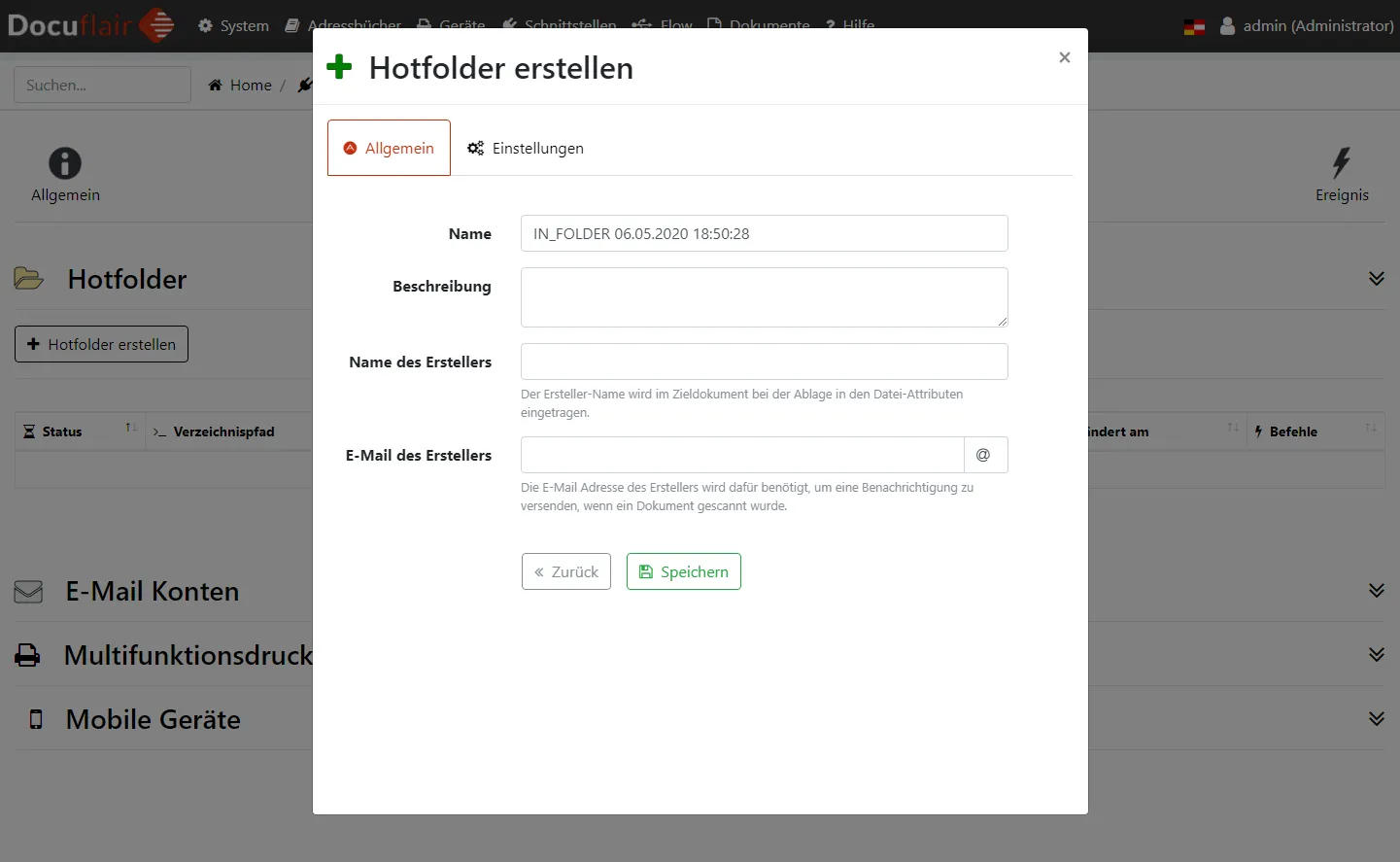 Im ersten Schritt, auf der Seite Allgemein, muss unter Name eine eindeutige Bezeichnung vergeben werden; eine Beschreibung ist optional. Name und E-Mail des Erstellers sind erforderlich, wenn der Urheber der Dokumente in einem Hotfolder für die weitere Verarbeitung erforderlich ist oder zum Beispiel Metadaten mit diesen Informationen befüllt werden sollen.
