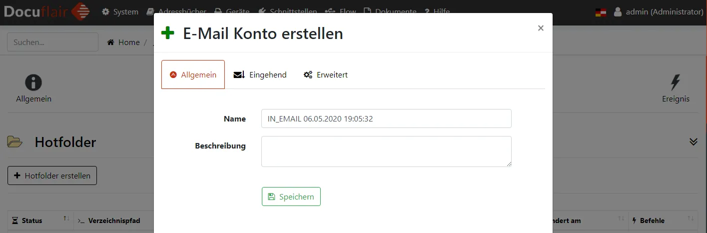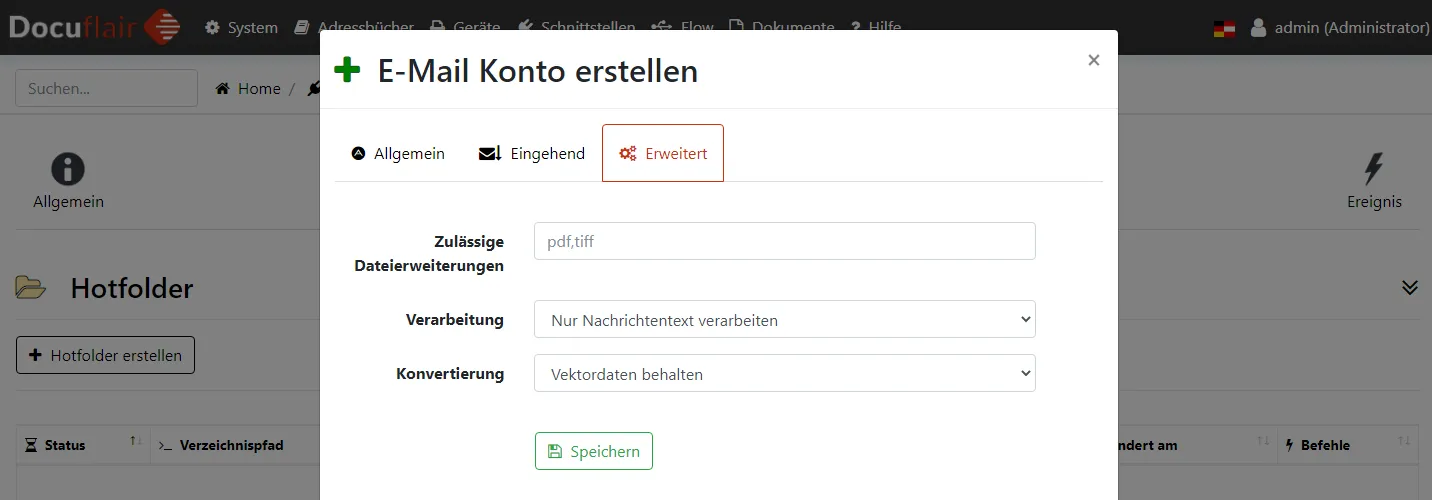 Erlaubt das Überwachen eines Ordners auf neu einlangende Dokumente. Wird ein Dokument von Docuflair entdeckt, beginnt nach etwa 15 Sekunden die Verarbeitung, indem gegebenenfalls das Dokument konvertiert wird oder direkt an einen Workflow übermittelt wird. - E-Mail-Postfächer