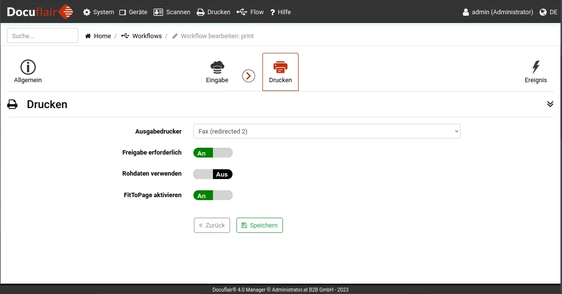 Die Druckoptionen legen fest, auf welchem Drucker ein Workflow seine verarbeiteten Dokumente ausgibt. Hier wird der Zieldrucker ausgewählt und konfiguriert, ob eine manuelle Freigabe vor dem Druck erforderlich ist.