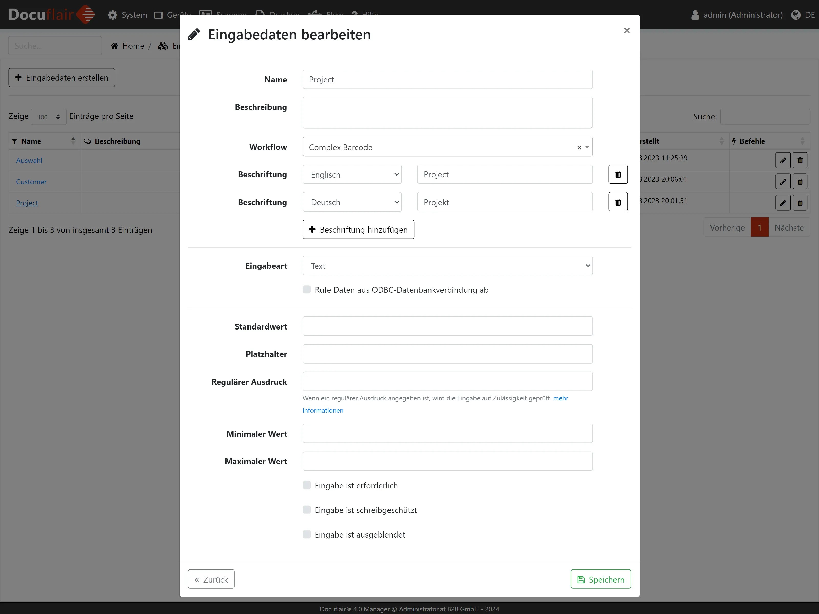 In bestimmten Szenarien kann es erforderlich sein, dass beim Scannen weitere Informationen mitgegeben werden sollen. Um diese Anforderung abzudecken gibt es in Docuflair die Eingabedaten im Menü unter Flow gefunden werden können.