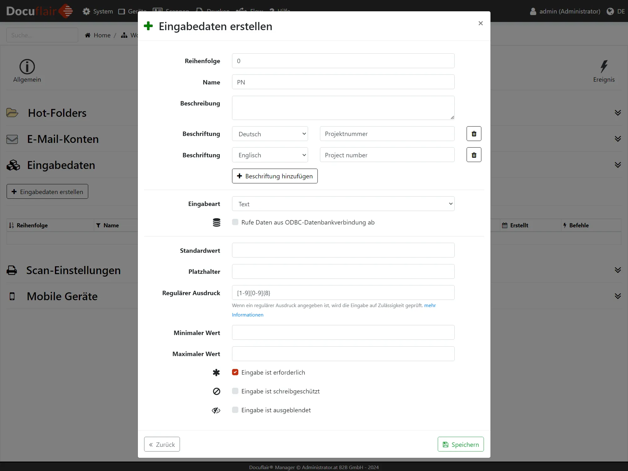 Eingabedaten sind zusätzliche Informationen, die ein Benutzer beim Scannen am Gerät eingeben kann — z.B. eine Projektnummer, einen Kundennamen oder eine Kostenstelle. Diese Werte werden als Variablen gespeichert und können in der weiteren Verarbeitung (z.B. im Dateinamen oder Speicherpfad) verwendet werden.