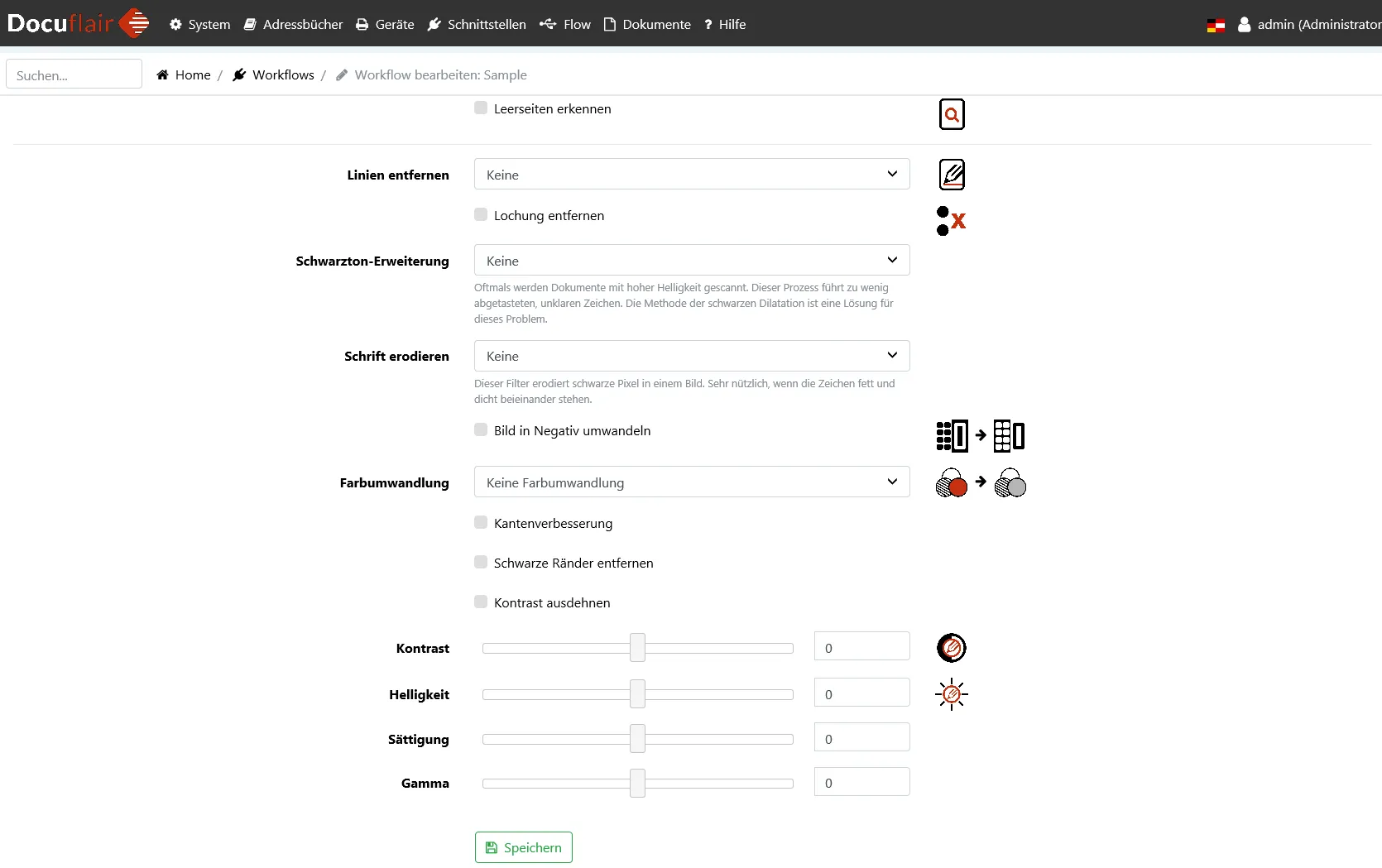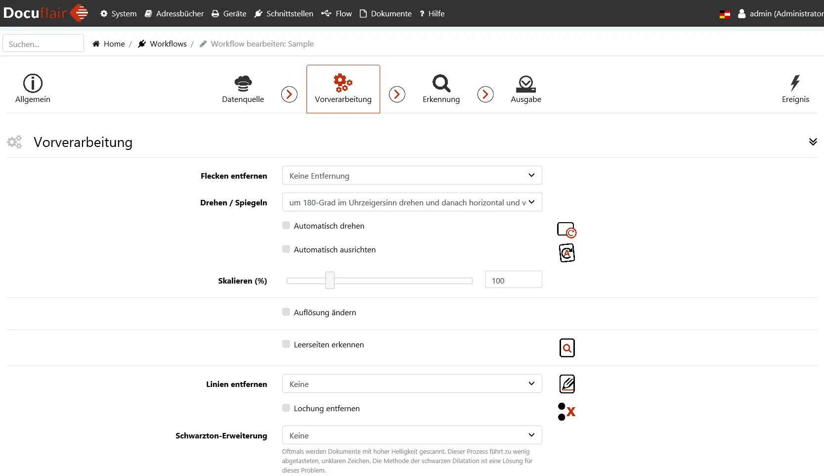 Die Vorverarbeitung bietet verschiedene Bildverbesserungsmethoden zur Verarbeitung von Bilddokumenten. Die Vorverarbeitung wird als erster Arbeitsschritt für einlangende Dokumente durchgeführt. Also vor jeder Erkennung nach Text oder Barcodes und vor dem Speichern von Ausgabedateien. Ist keine Vorverarbeitung gewünscht, sollte als Workflow-Typ Eingabe/Ausgabe gewählt werden. Die Vorverarbeitung erfolgt seitenorientiert, d.h. jede Seite wird unabhängig verarbeitet und hat keine Auswirkung auf andere Seiten.