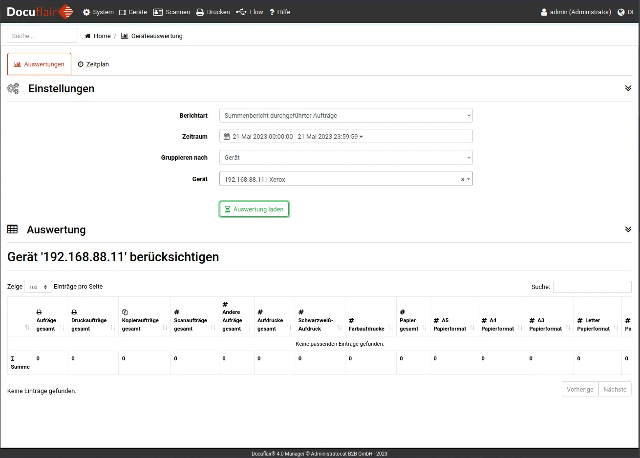 Geräteauswertungen zeigen, welche Kosten durch Drucken und Kopieren an den einzelnen Geräten entstanden sind. Anhand hinterlegter Preislisten berechnet Docuflair die Kosten pro Benutzer, Gerät und Zeitraum — nützlich für die interne Kostenverrechnung.
