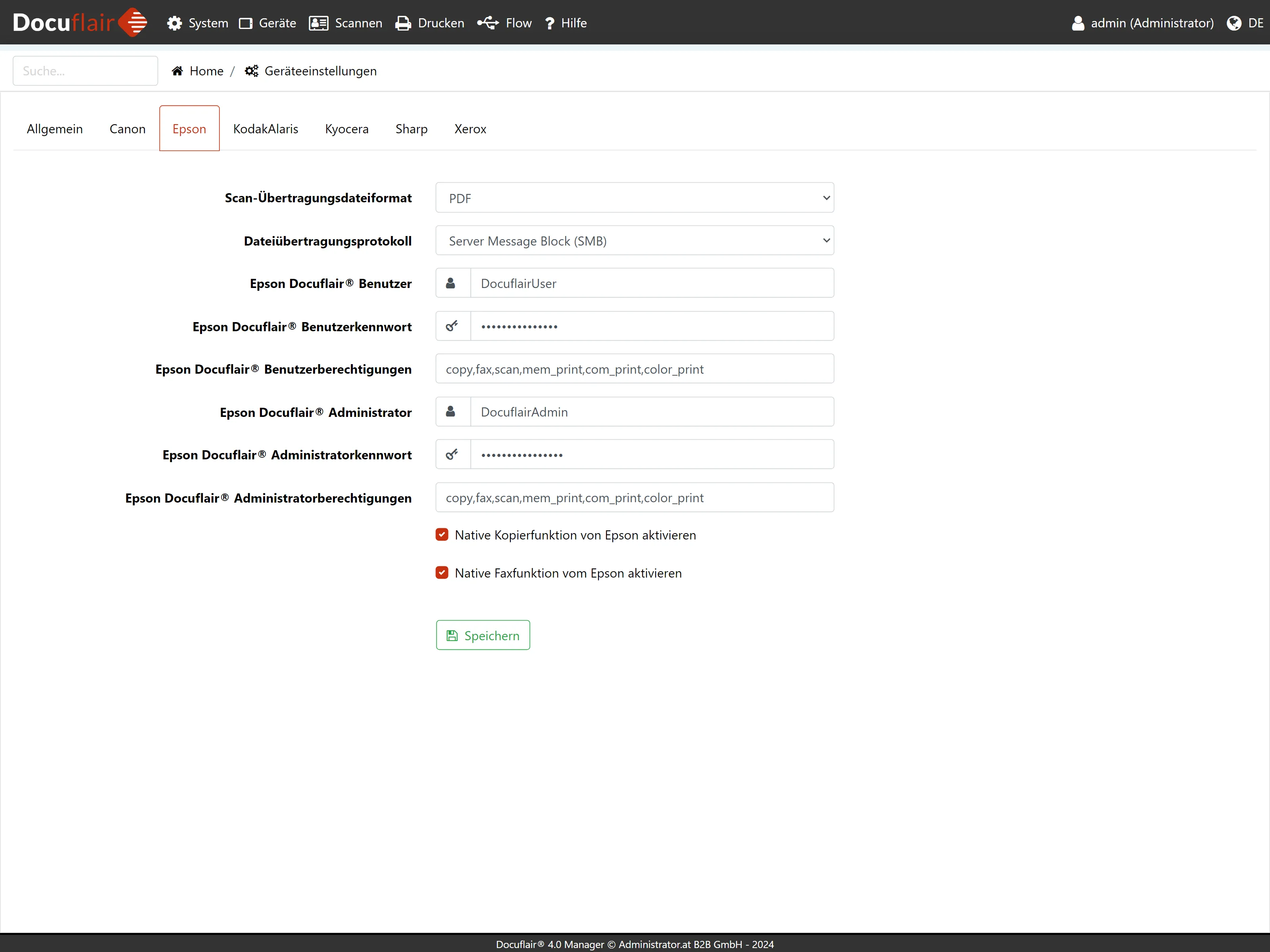 Ein Epson Docuflair Benutzer und Administrator sollte ebenfalls konfiguriert werden. Es können direkt Berechtigungen für Admin und Benutzer gewählt werden.